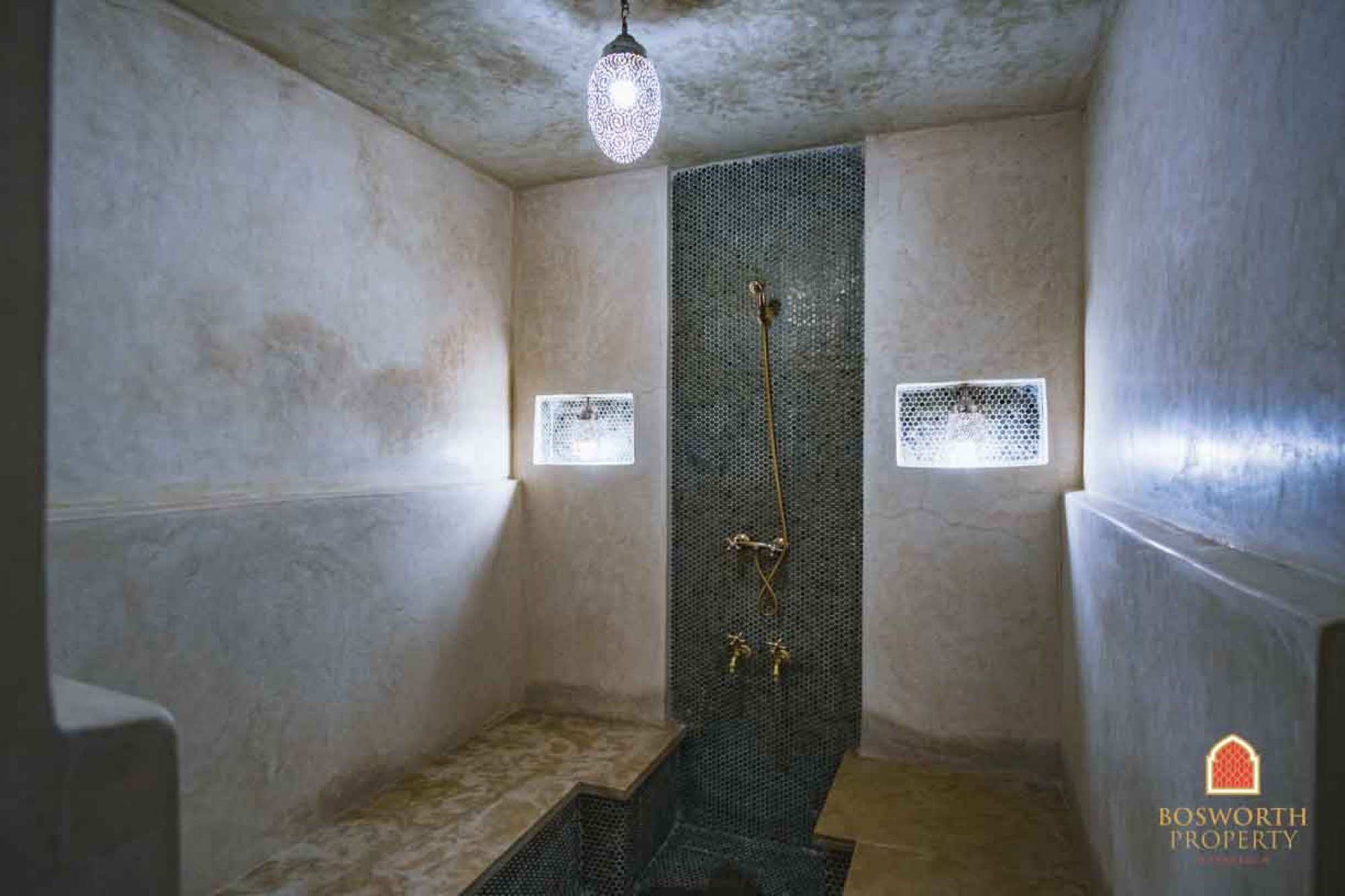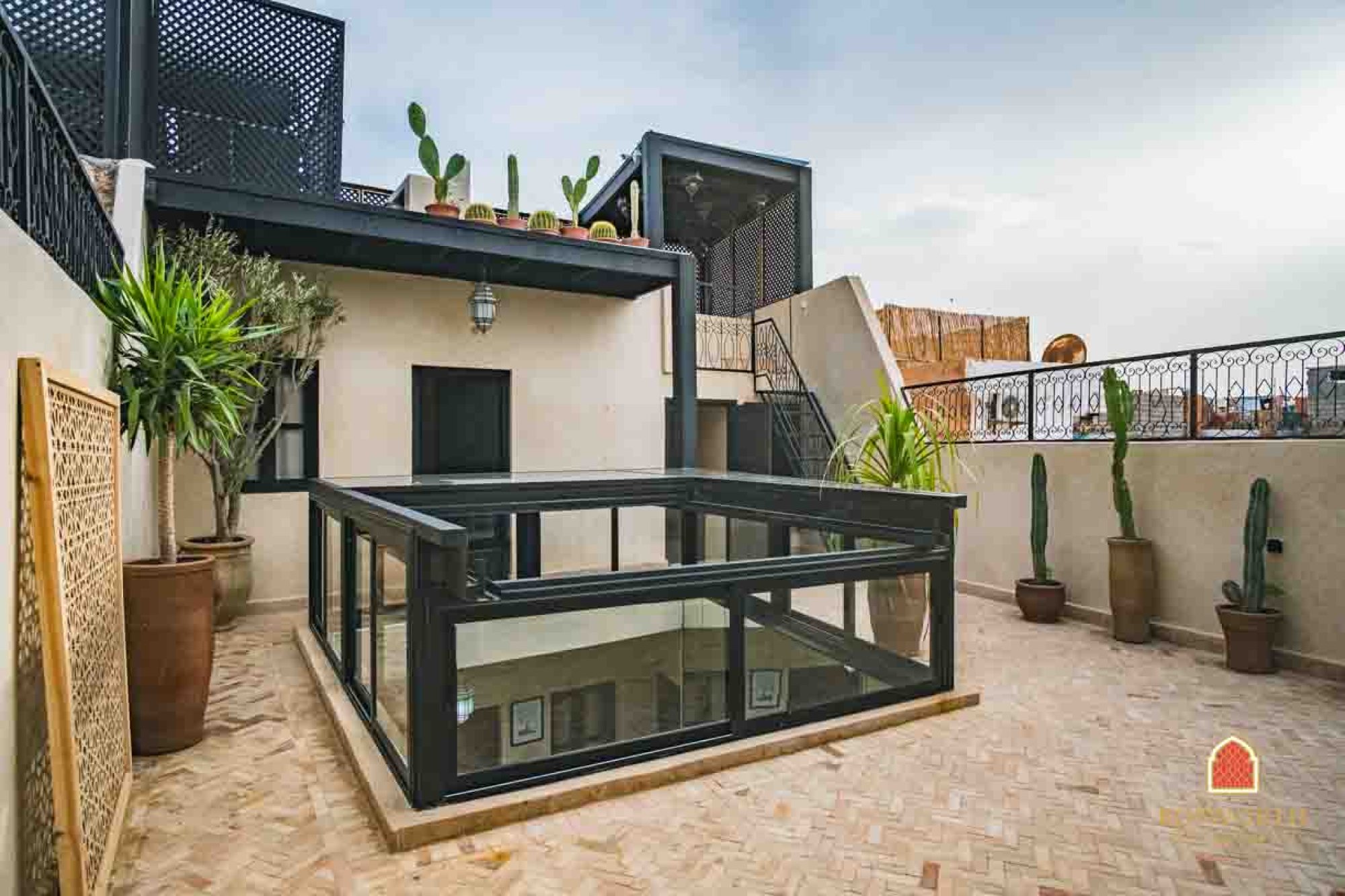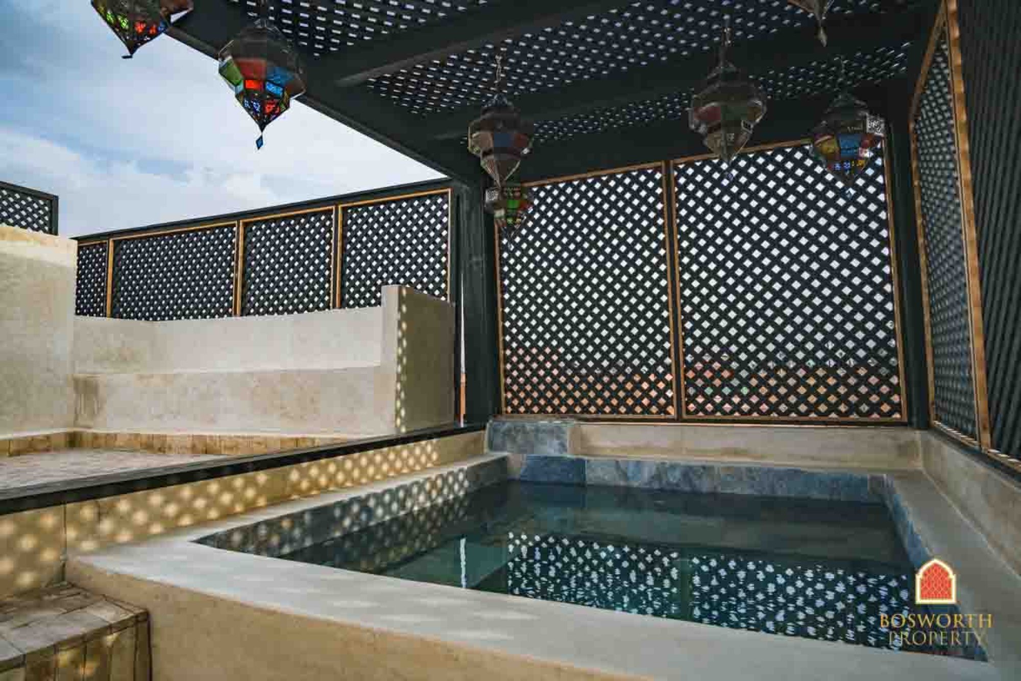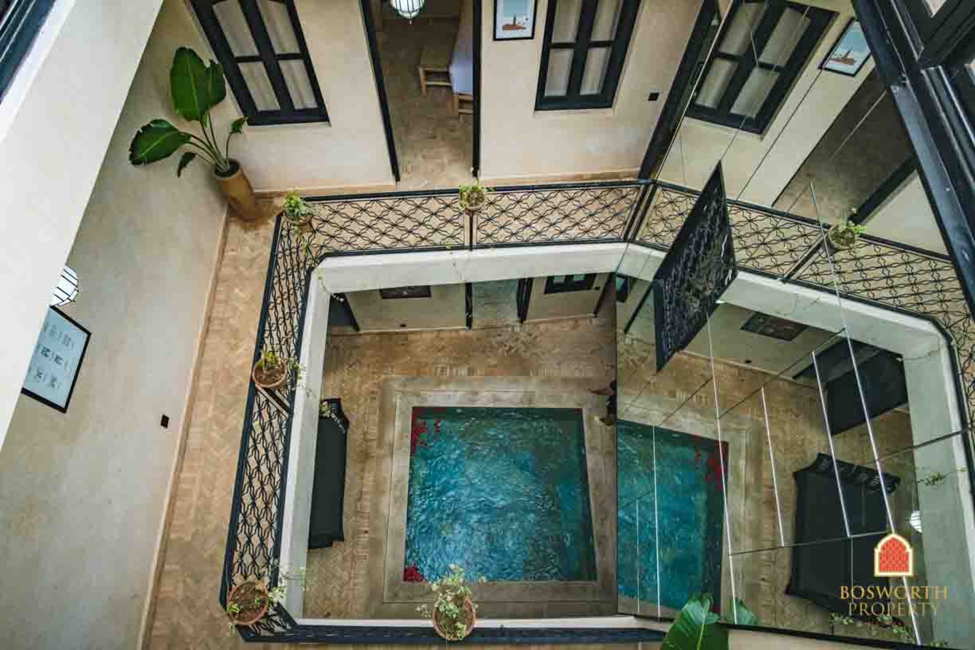 There is a big plunge in the patio courtyard. And a roof top jacuzzi too! There is a modern kitchen and a super cute Hammam. The terraces are excellent and the high terrace actually boasts a little summer kitchen. New electrics and new plumbing throughout. All in all a prefect Marrakech home from home. And this would do really well on short term rental platforms such as AirBnB.