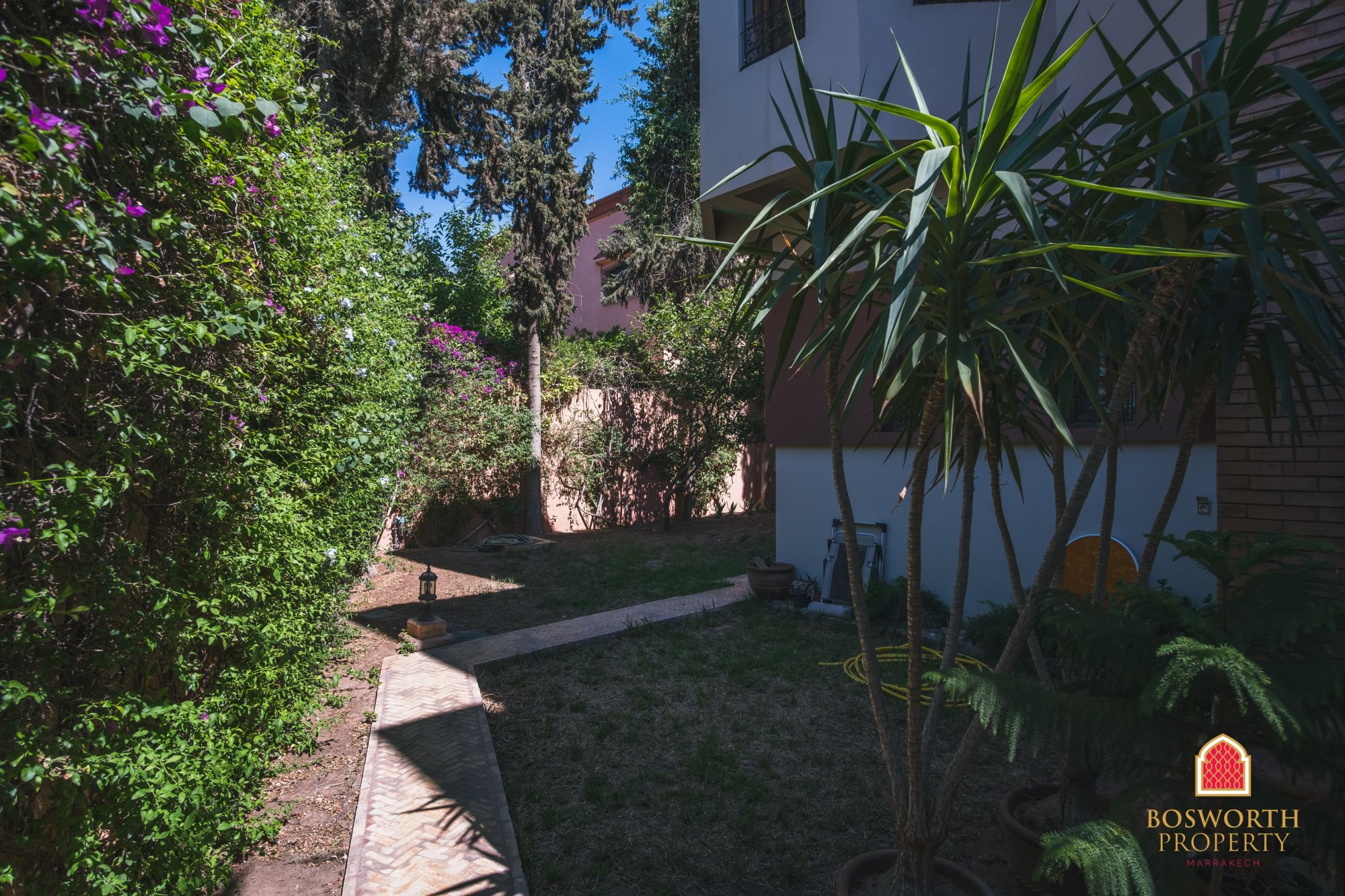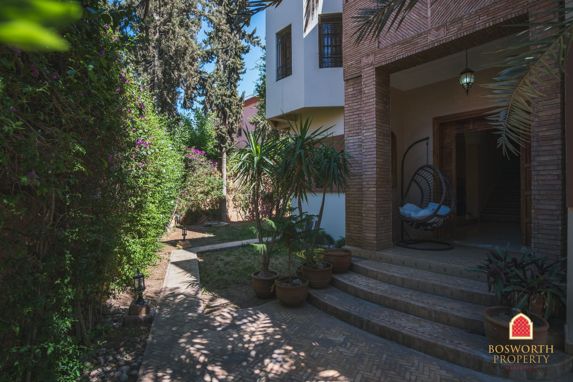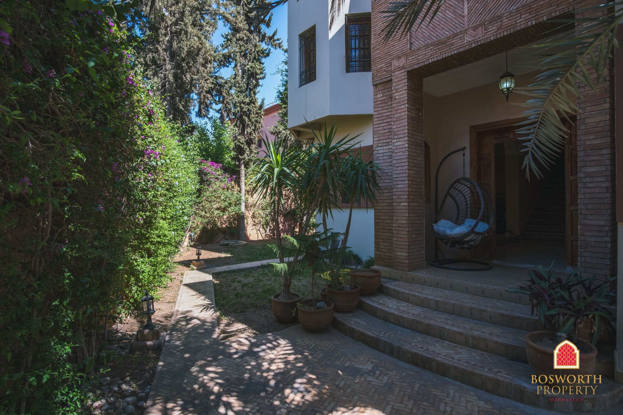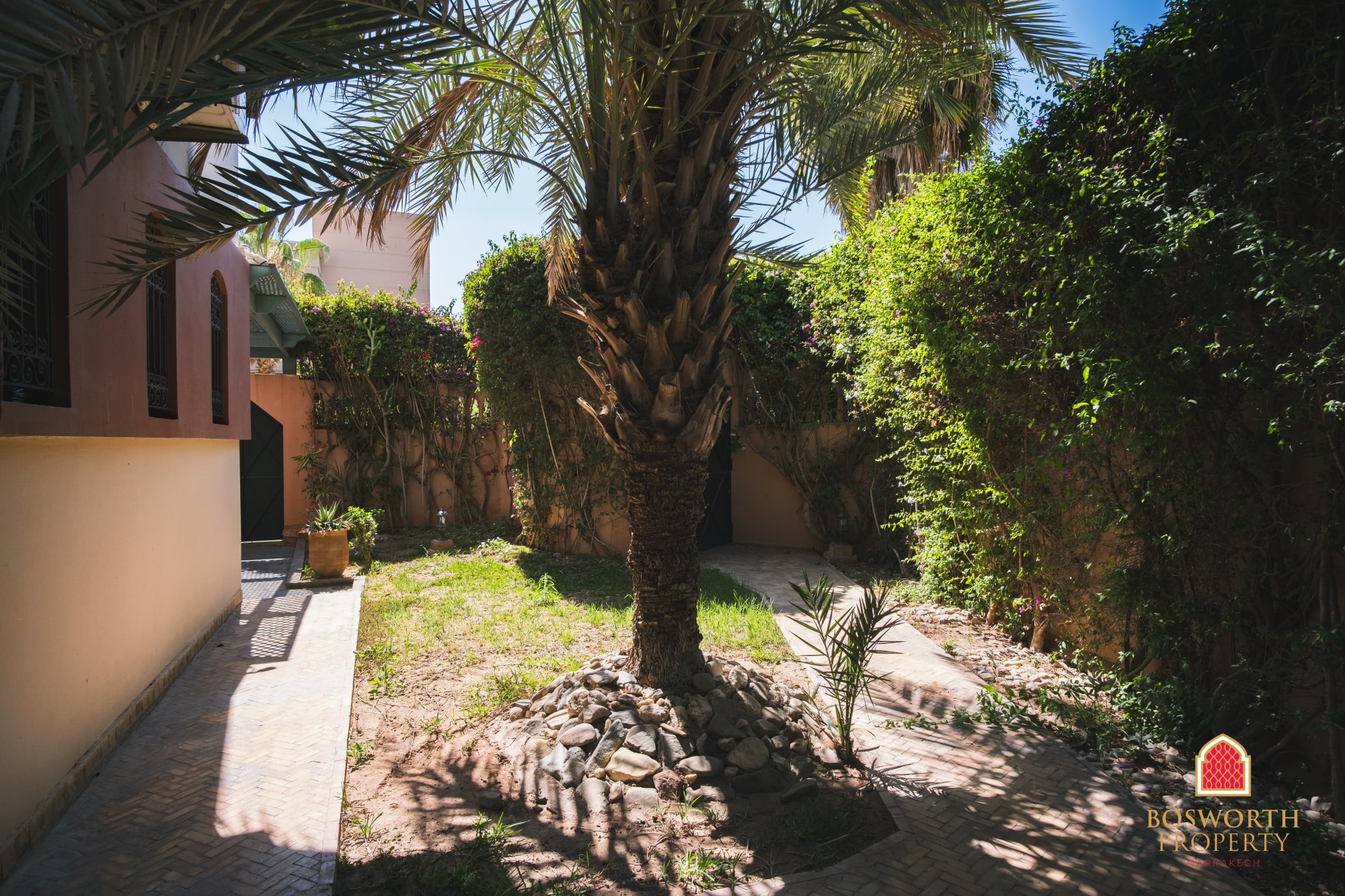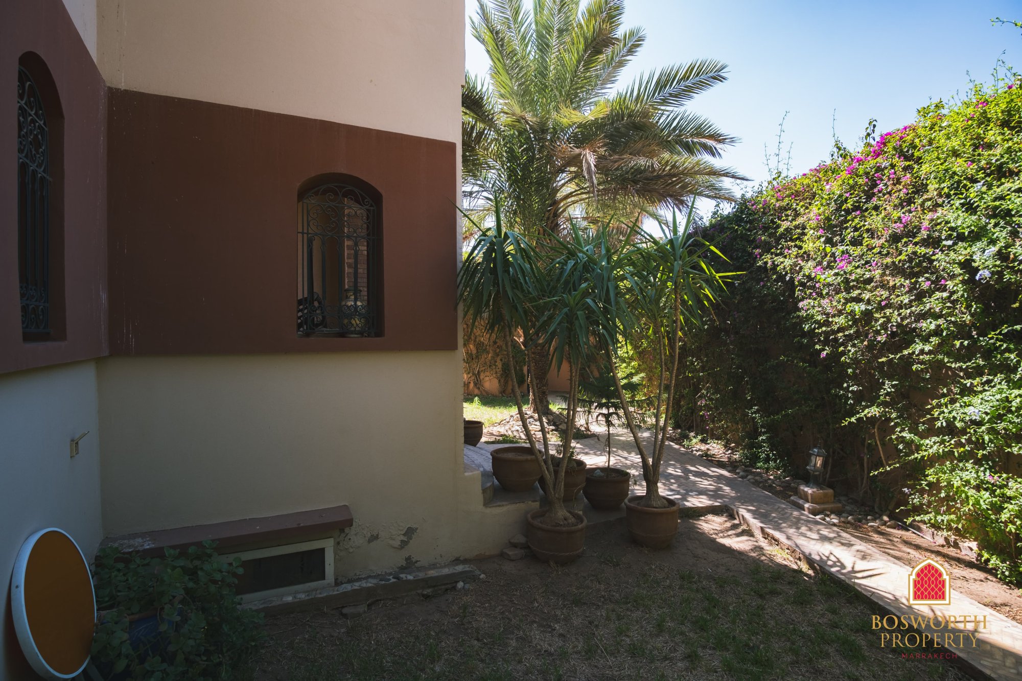 As you step through the gate, you’re welcomed by a beautiful date palm from Errachidia, planted 22 years ago when the villa was built. It still bears fruit, adding a personal and authentic touch to the landscaped garden.