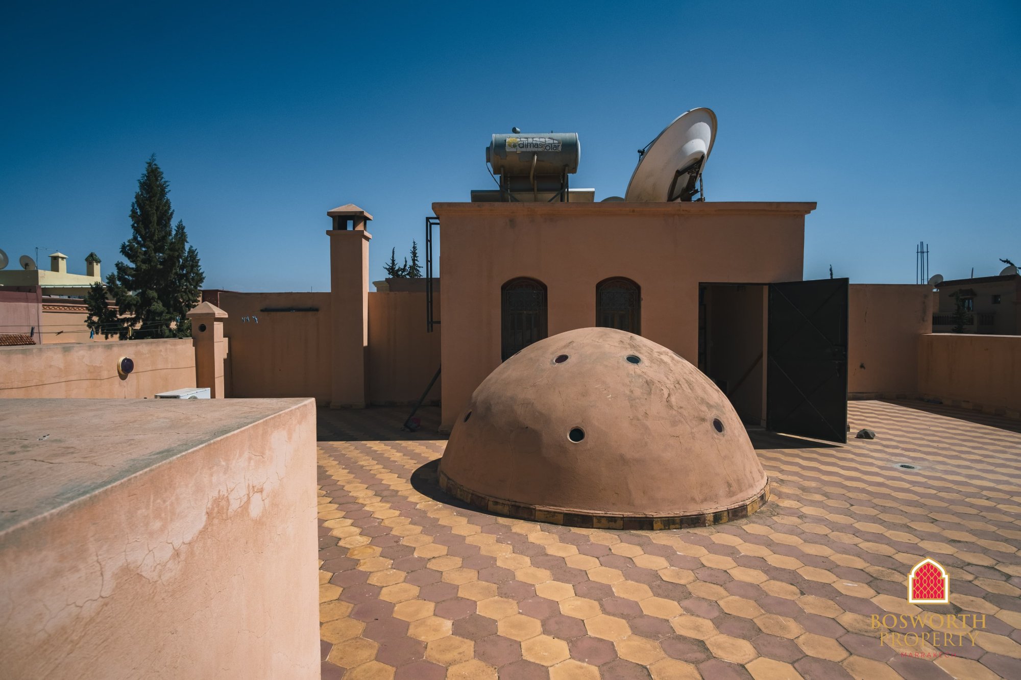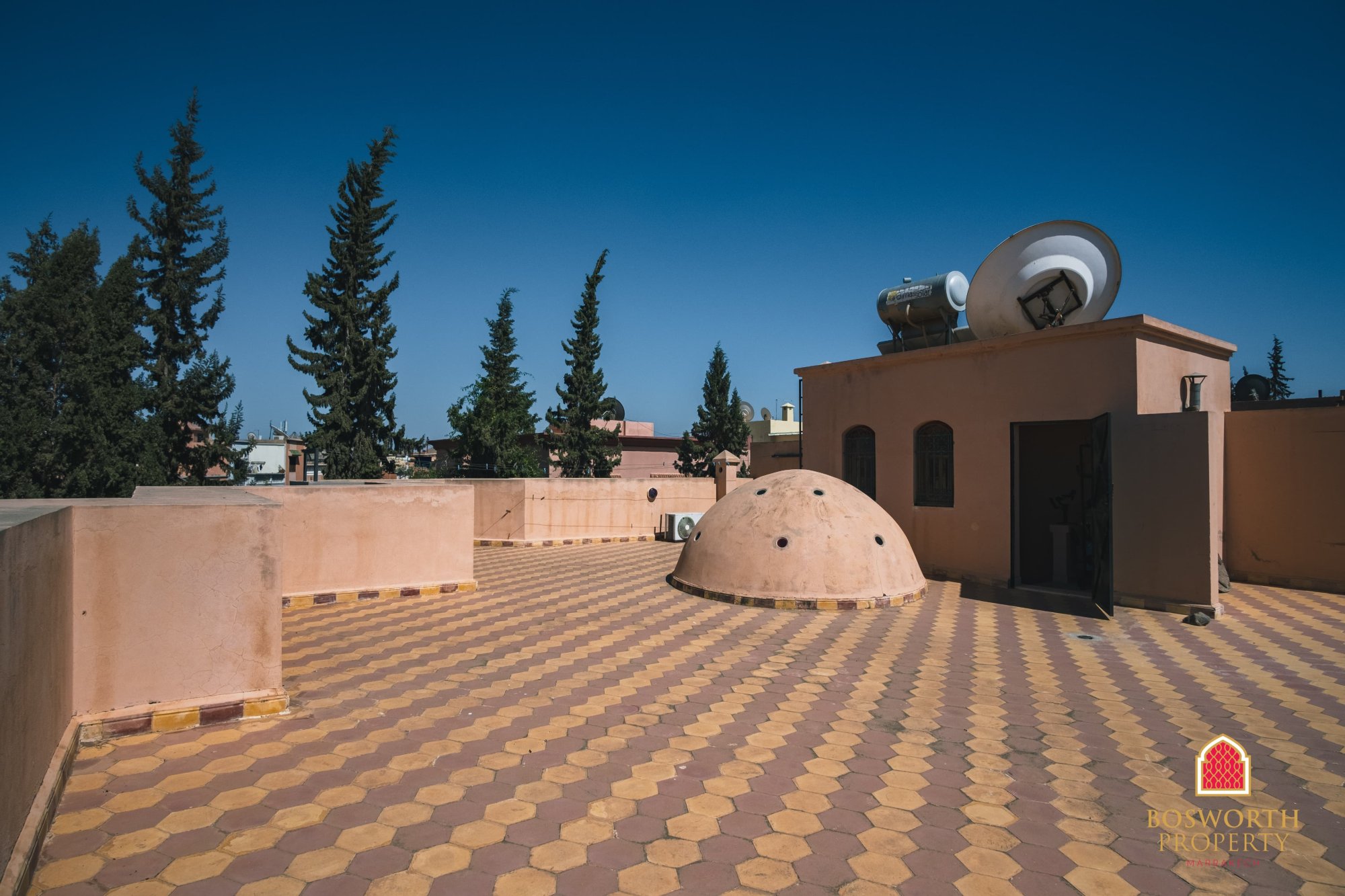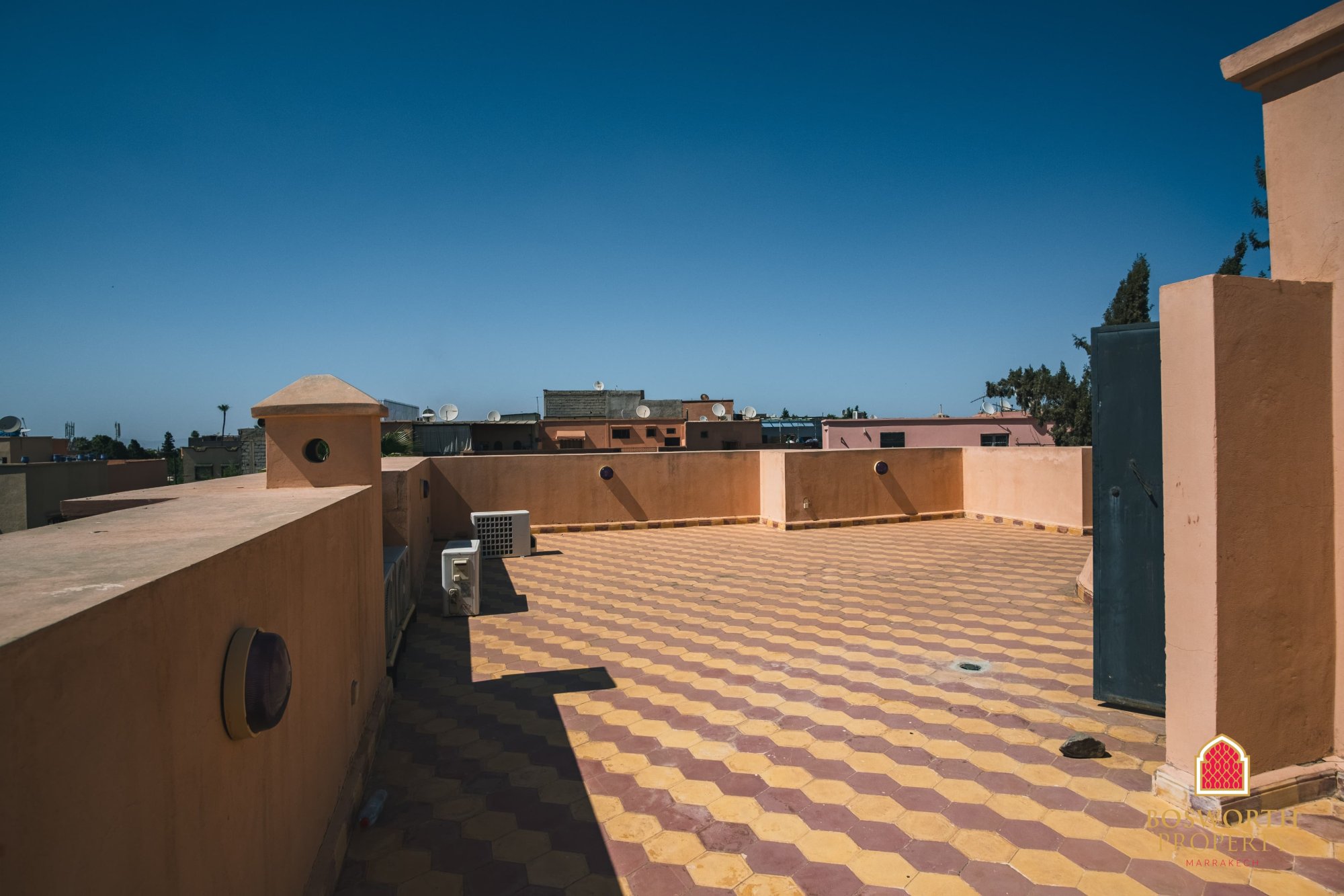 The rooftop terrace enjoys open views over the peaceful, well-kept neighbourhood. It’s already equipped with a solar panel, a satellite dish, and a laundry area, with plenty of space left to develop further outdoor amenities.