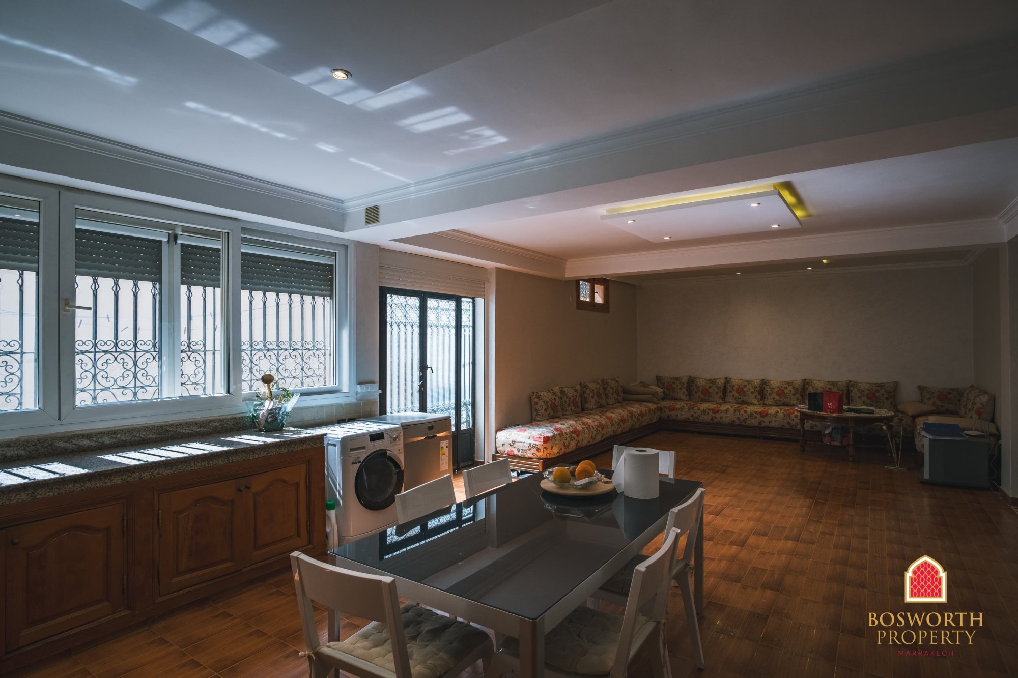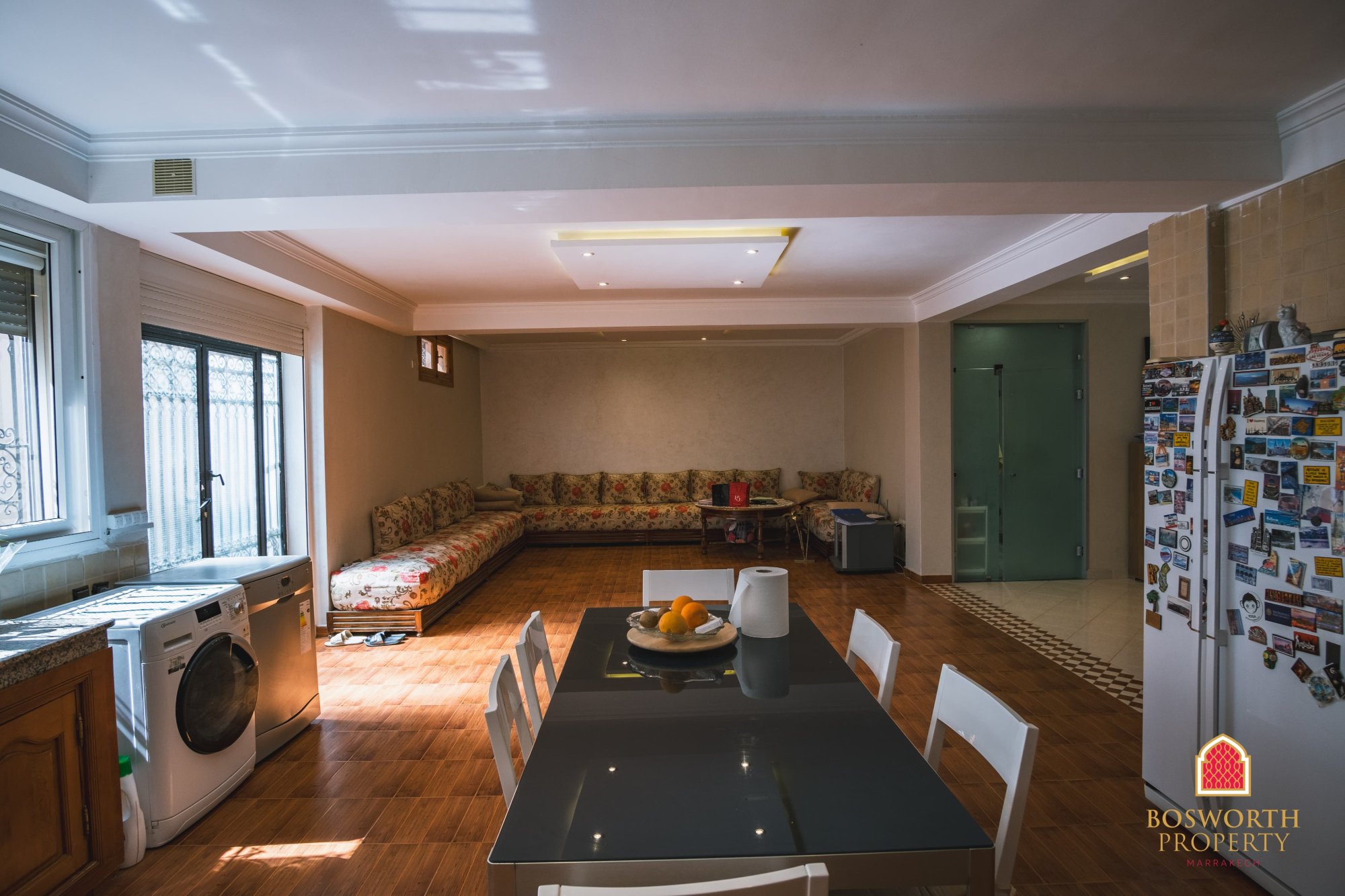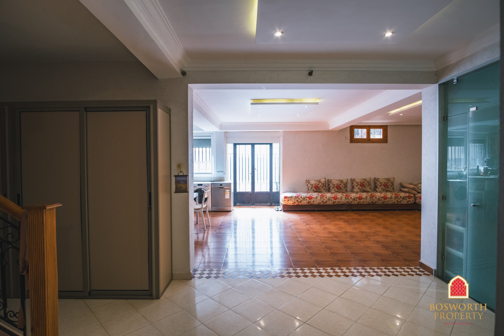 This charming and spacious family villa is located in the sought-after Targa Masmoudi neighbourhood - just 10 minutes from the vibrant centre of Gueliz and under 20 minutes from the historic heart of Marrakech, Jemaa El-Fnaa. With a built area of 387m2 across three levels, this home offers style, space, and real versatility.