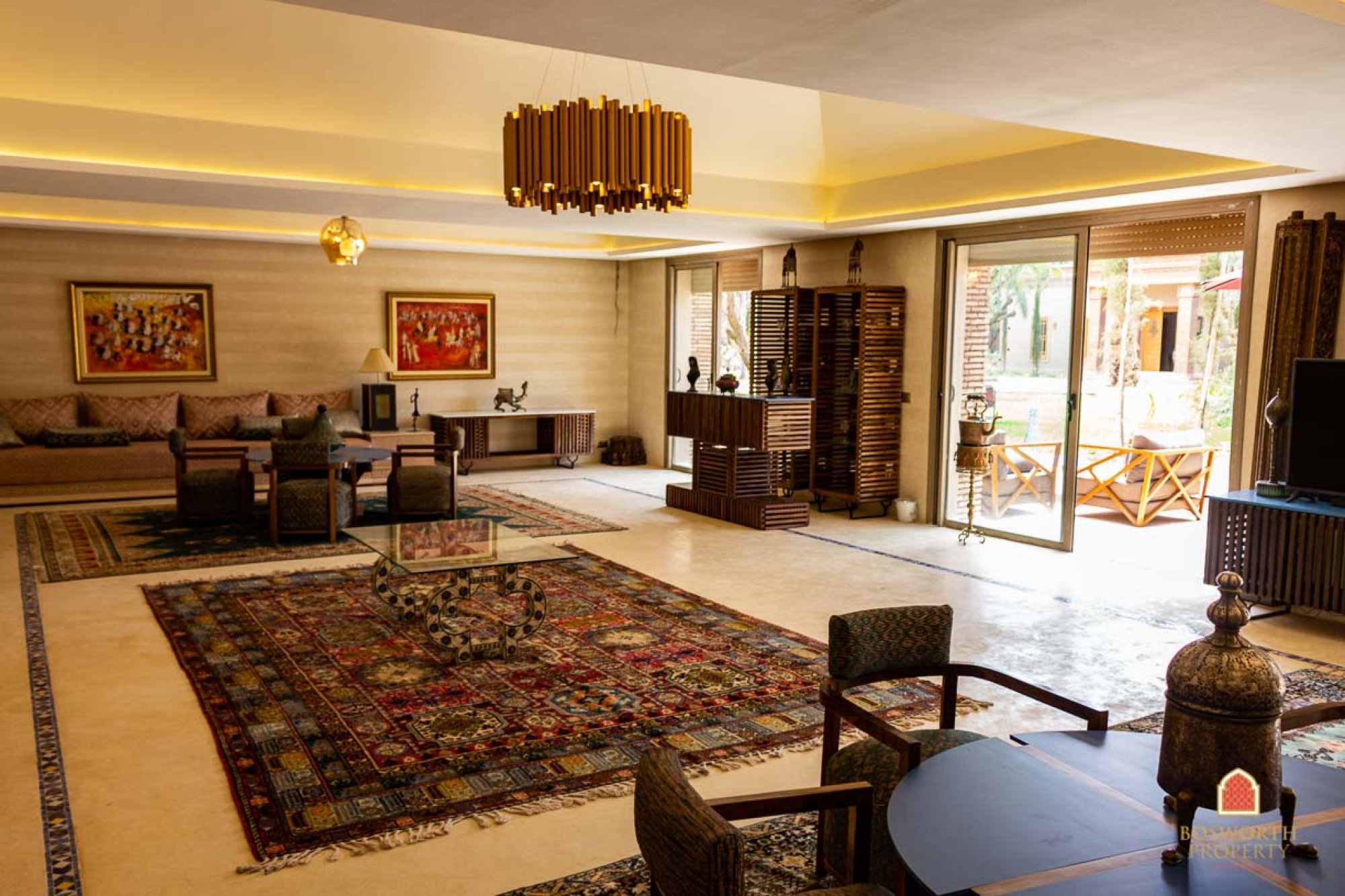 Excellent Luxury Villa For Sale Marrakech Palmeraie. 1 hectare of mature gardens. 8 lovely suites. In the perfect location right by the Barcelo Hotel – accessible yet quiet. Lovely pool. Stunning glass fronted sitting room. Internal courtyard with fountain. Very good terraces. Great back of house with staff quarters and kitchens. Vast external reception room with it’s own kitchen. Spa with hammam and sauna! Car port for 4 vehicles.The property is finished to the highest international standard, with lots of imported marble and the use of noble woods throughout. The art collection is stunning. With an asking price of only 3.75m euros this is a fabulous investment opportunity. Call me now on +212658025028 or mail [email protected] and I will arrange a private viewing for you. Thank you!