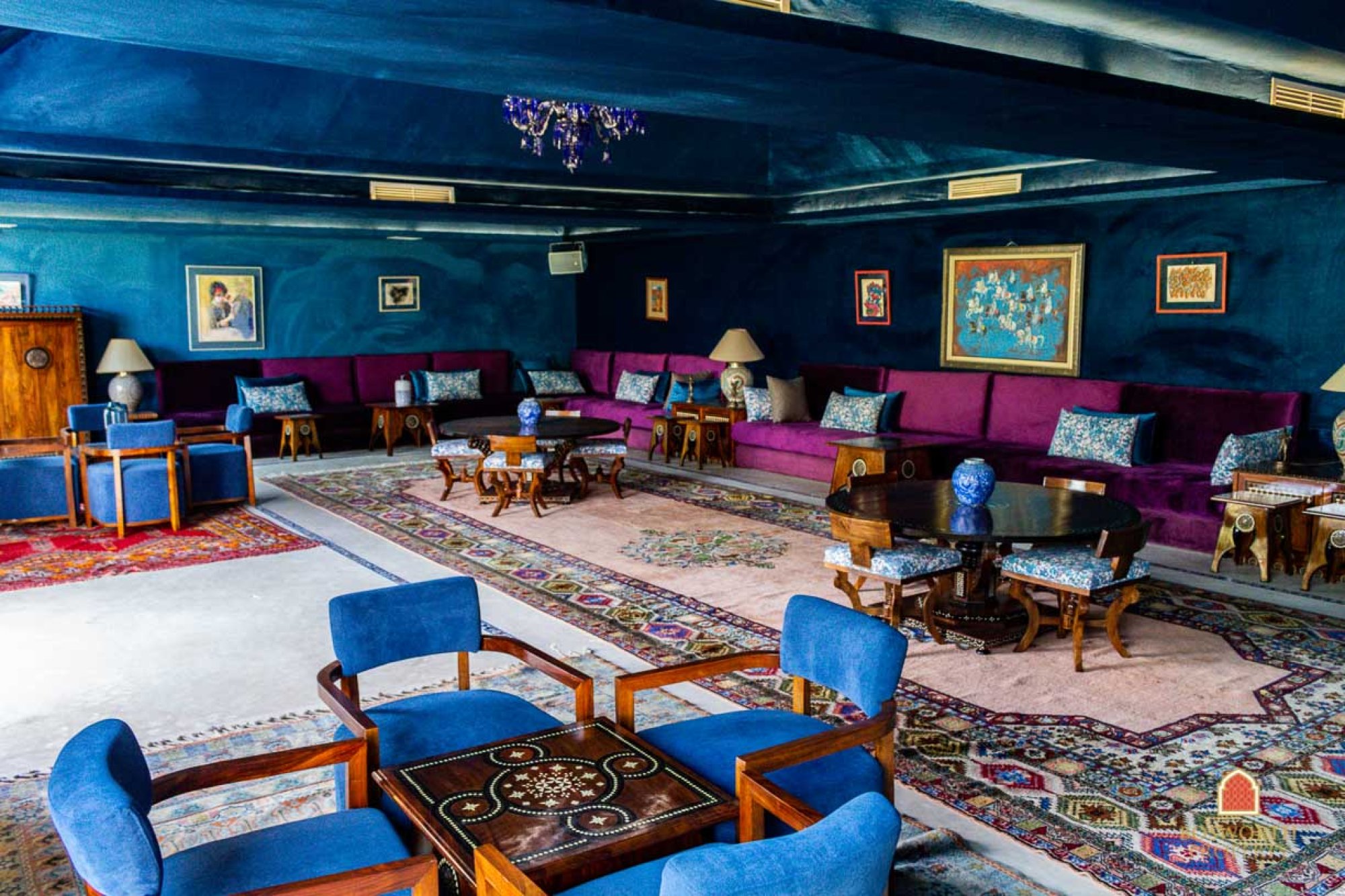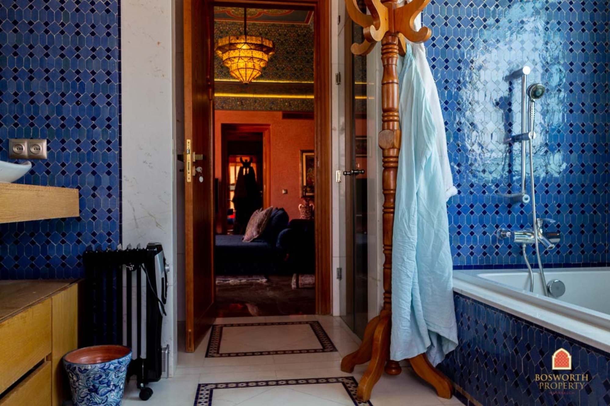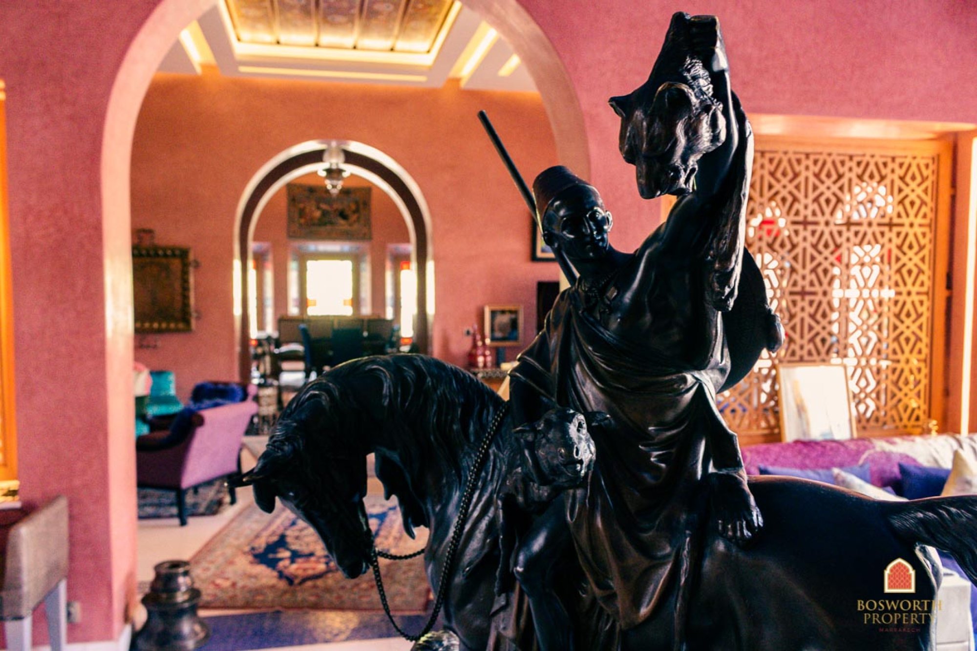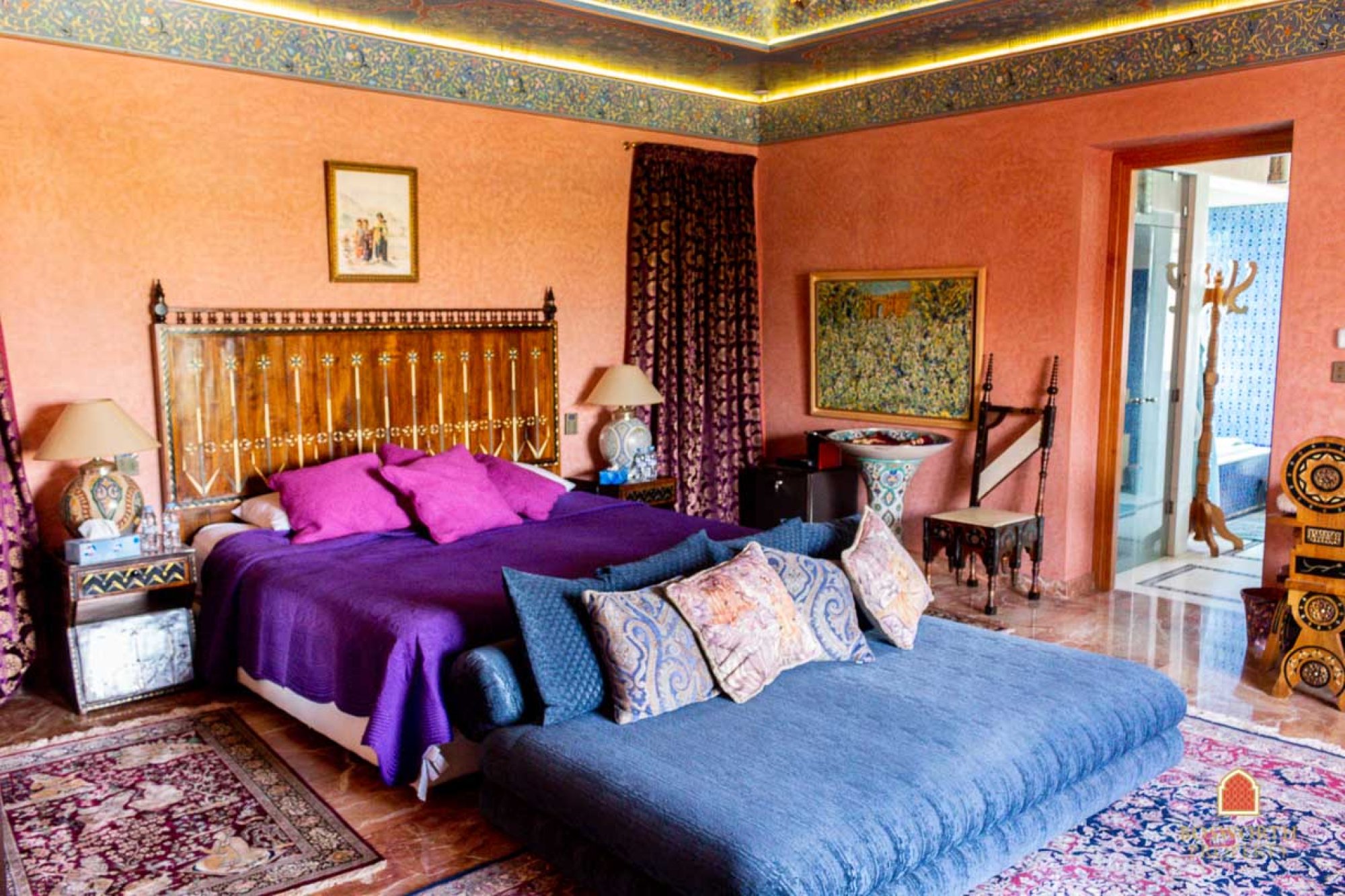The villa itself has andalousian influences and mauresque touches. It is finished to the highest quality throughout. Marble, noble woods, state of the art electronics. And it contains the most excellent art collection – antiques from eleven different countries, original artwork from famous Moroccan painters, top quality textiles, Bugatti furniture …