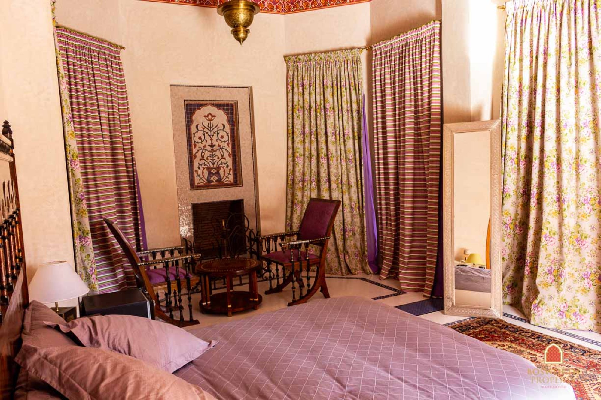 Fabulous Luxury Villa For Sale Marrakech Palmeraie. Perfect location next to Palais Rhoul. Freehold title deed. 1 hectare of luxuriant gardens . 1640m2 footprint of buildings. Pools. Fountains. The main house comprises multiple sitting rooms. 6 suites. Spa with hammam. Superb underground nightclub/lounge. Kitchens. Staff quarters with four bedrooms. The finishing is absolutely top class throughout – imported marble, noble woods – and fully automated with the latest domotic technology. The Villa is a veritable treasure trove of excellent antiques, persian carpets and original paintings – all on the themes of hunting and music. The furniture is wonderful. There is also an independent bungalow with a further 2 suites. There is a club luxury tent for your receptions. And even a small yet well equipped gym for your workouts. The carport takes five vehicles. This prestigious property is very good value at 3.95m euros. Call me now on +212658025028 or mail [email protected] and I will arrange a private viewing for you.