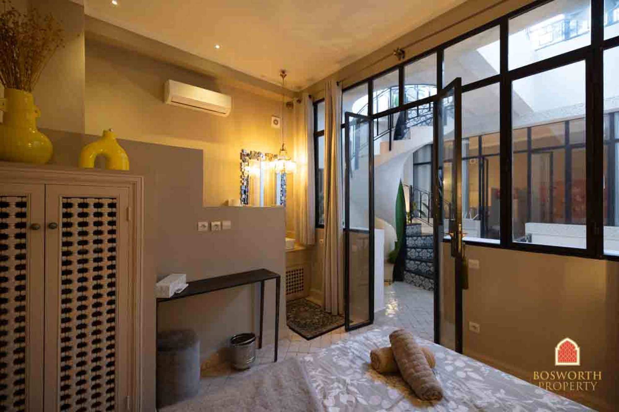 This Fabulous Sidi Mimoun Douiria For Sale Marrakech is a thing of rare beauty. Being sold key in hand. The design is wonderful, from the sweeping spiral staircase with its cast iron balustrade to the cut plaster features adorning the walls. Distribution is perfectly optimised throughout. The open plan kitchen melds into the dining area and from there into the glass fronted salon. Cosy and intimate, yet bright and spacious.