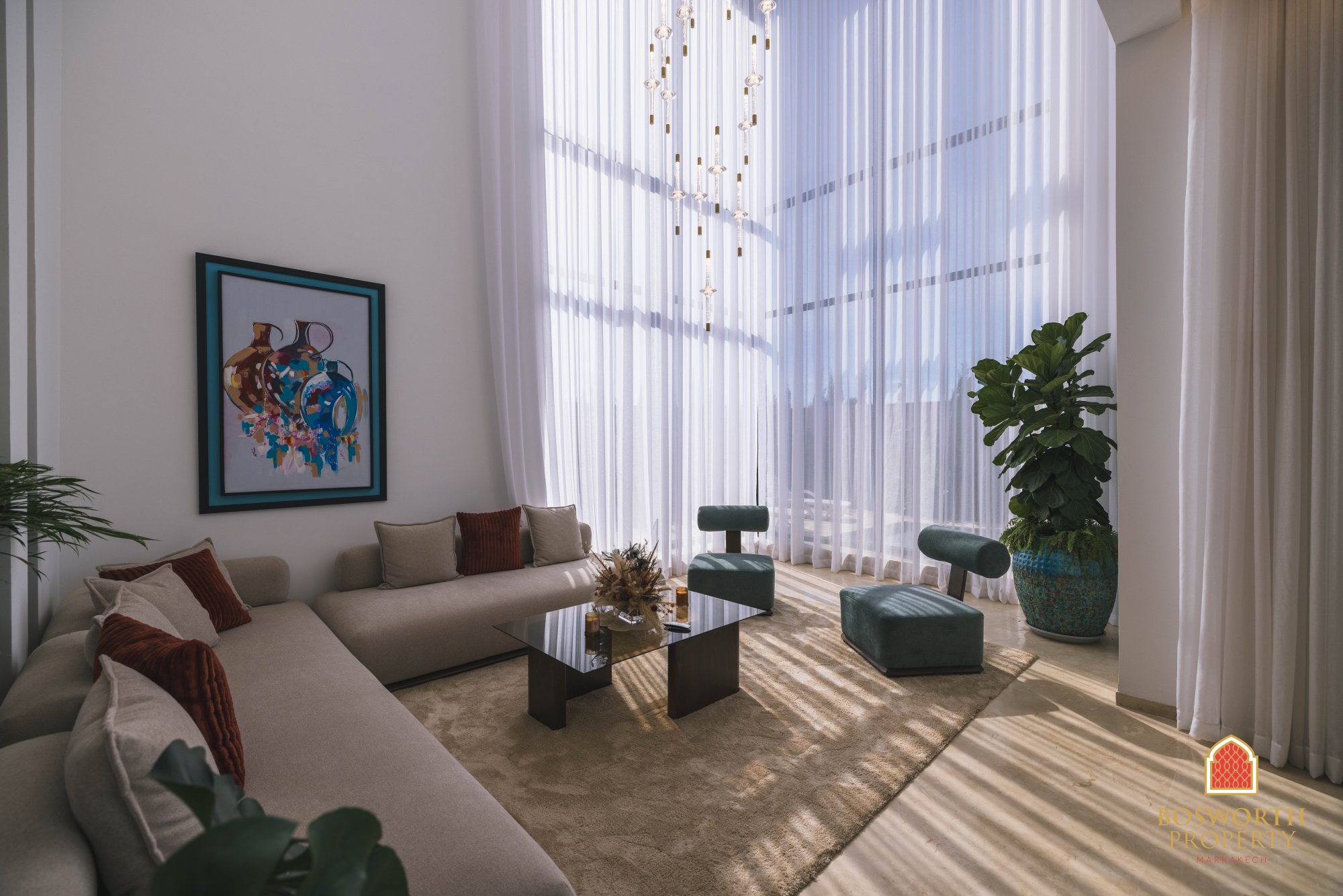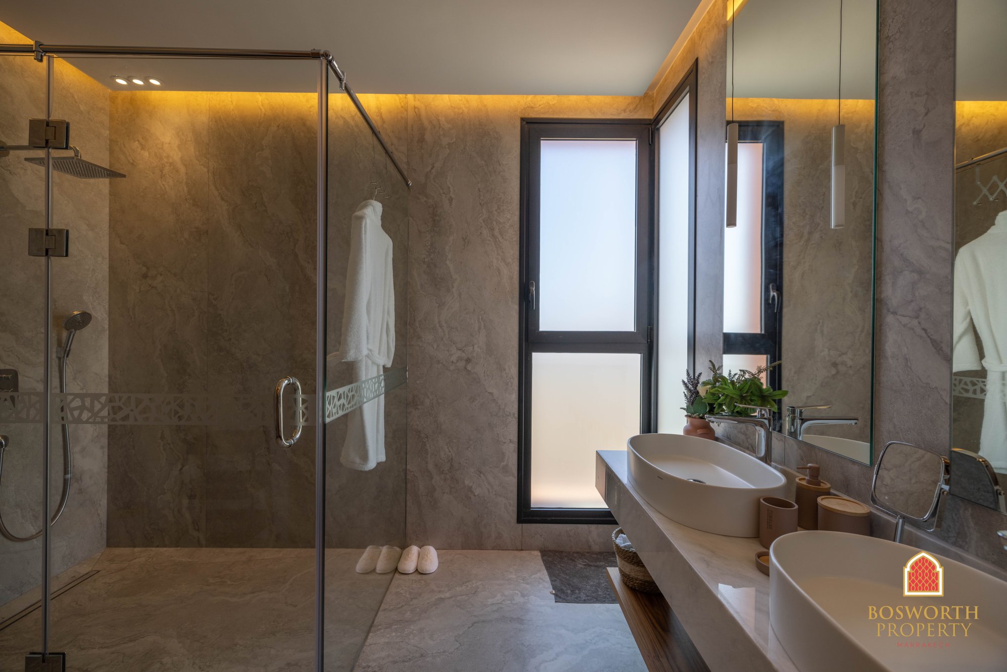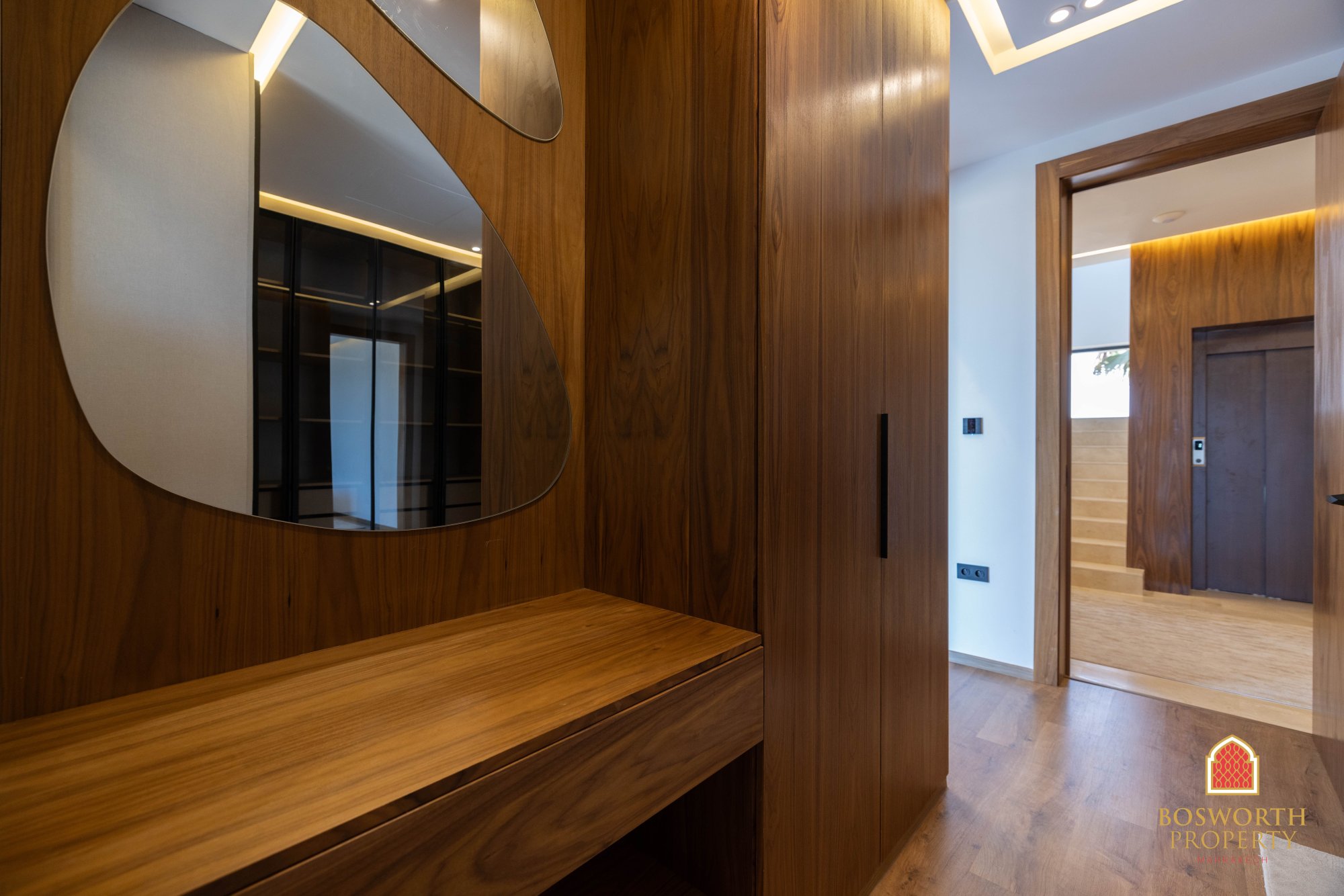 The upper floor is dedicated to private living quarters and features three exceptional en-suite bedrooms. Each is a master suite in its own right, finished with wide-plank flooring, integrated LED lighting, bespoke wood wardrobes, and luxurious en-suite bathrooms, walk-in Italian showers with stone-effect tiling, and premium fixtures.