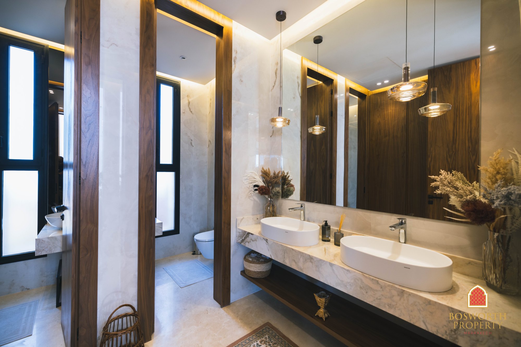 The reception spaces flow naturally into a minimalist, high-specification kitchen, designed as a functional yet elegant space for the chef of the house. A standout feature is the custom laser-cut Marrakech window screens, inspired by traditional "moucharabieh" design, which provide natural light, privacy, and distinctive character.