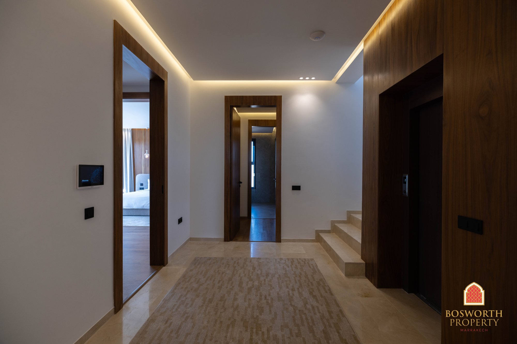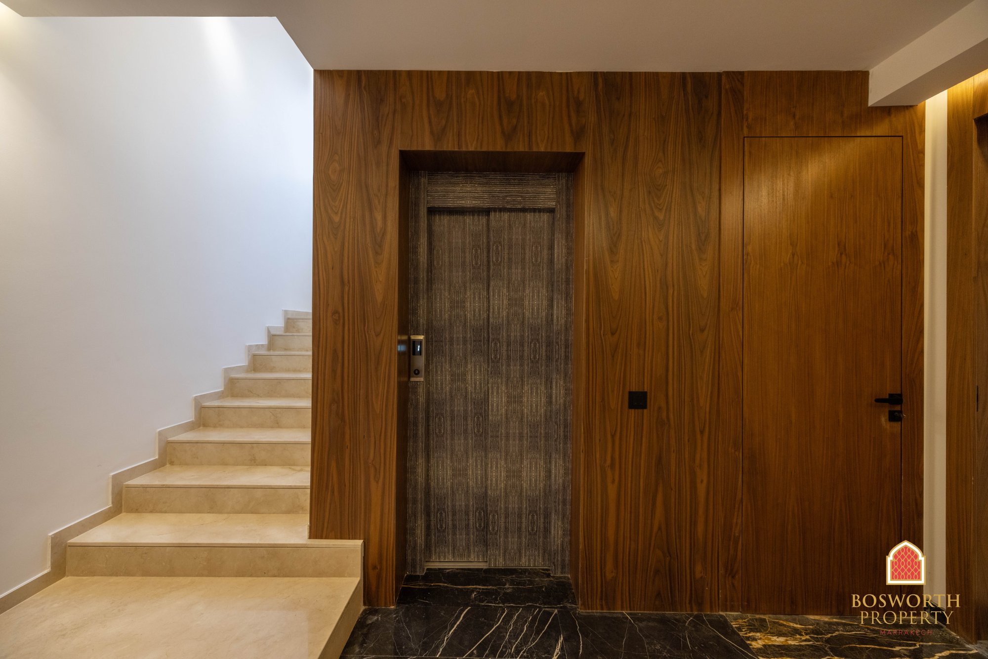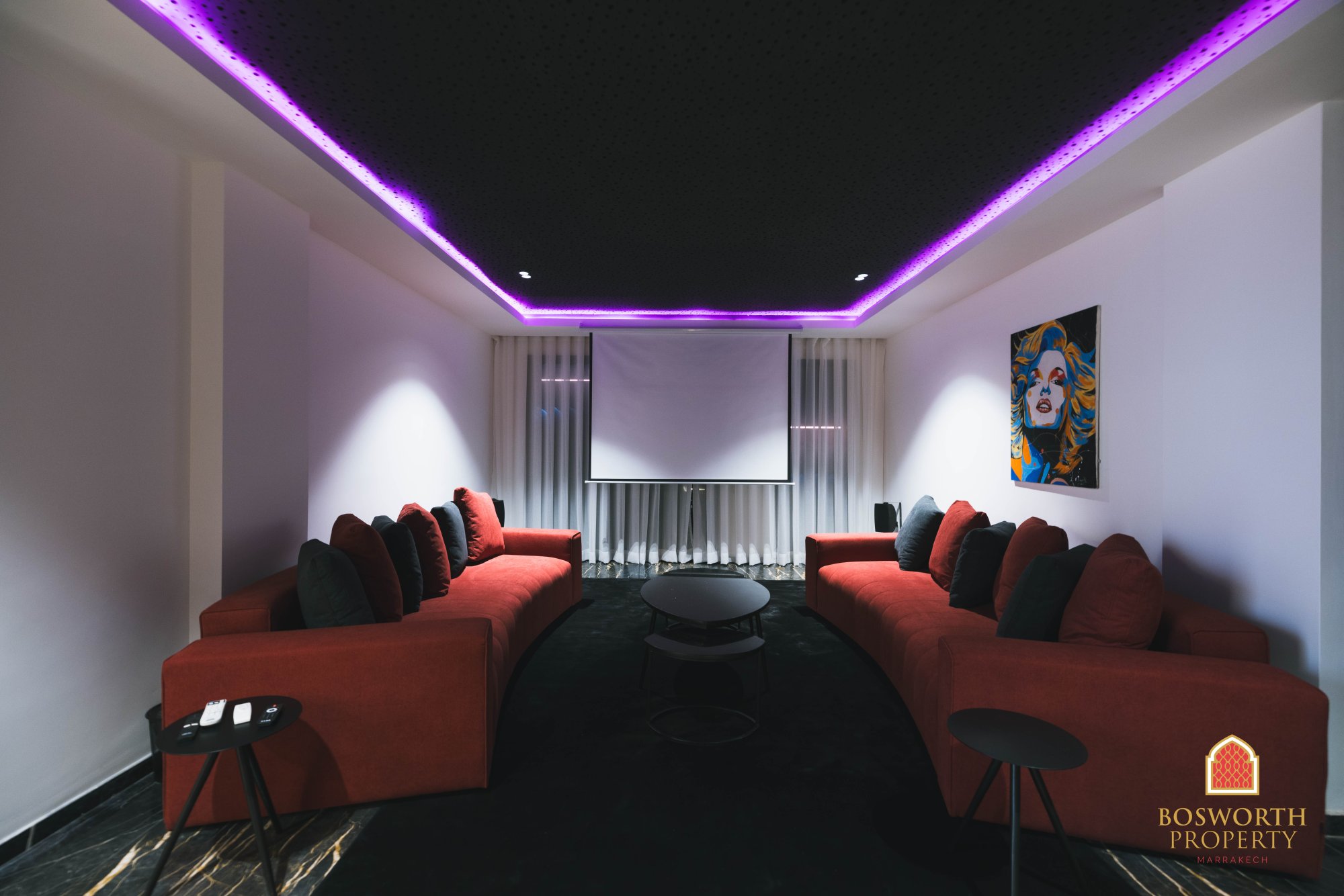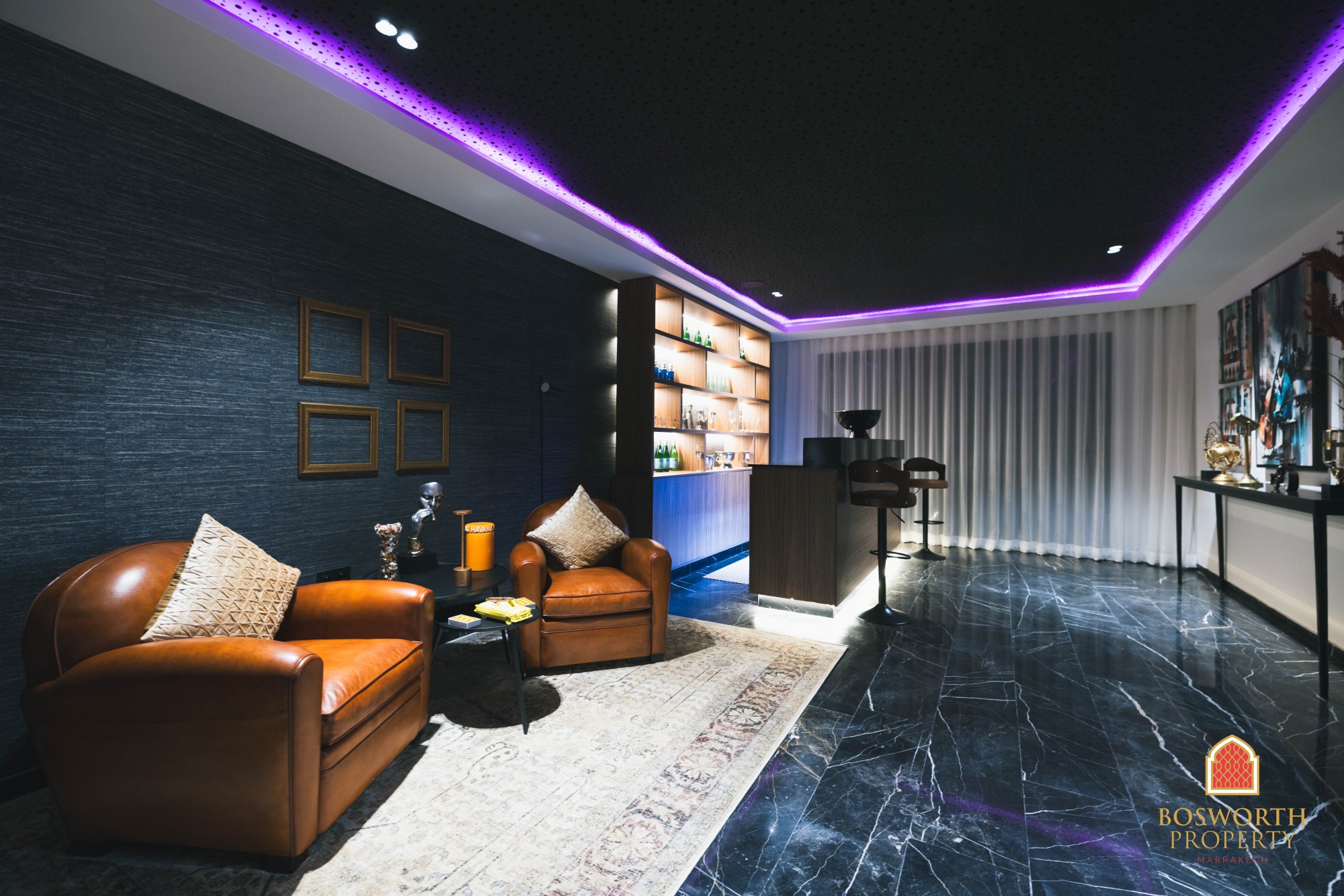 The lower ground floor is a true showstopper, featuring a professional-grade private cinema room, a stylish bar area, and a dedicated cigar lounge, ideal for entertaining on warm Marrakech evenings. Accessible via the internal lift, this level serves as the ultimate entertainment hub or sophisticated "man cave".