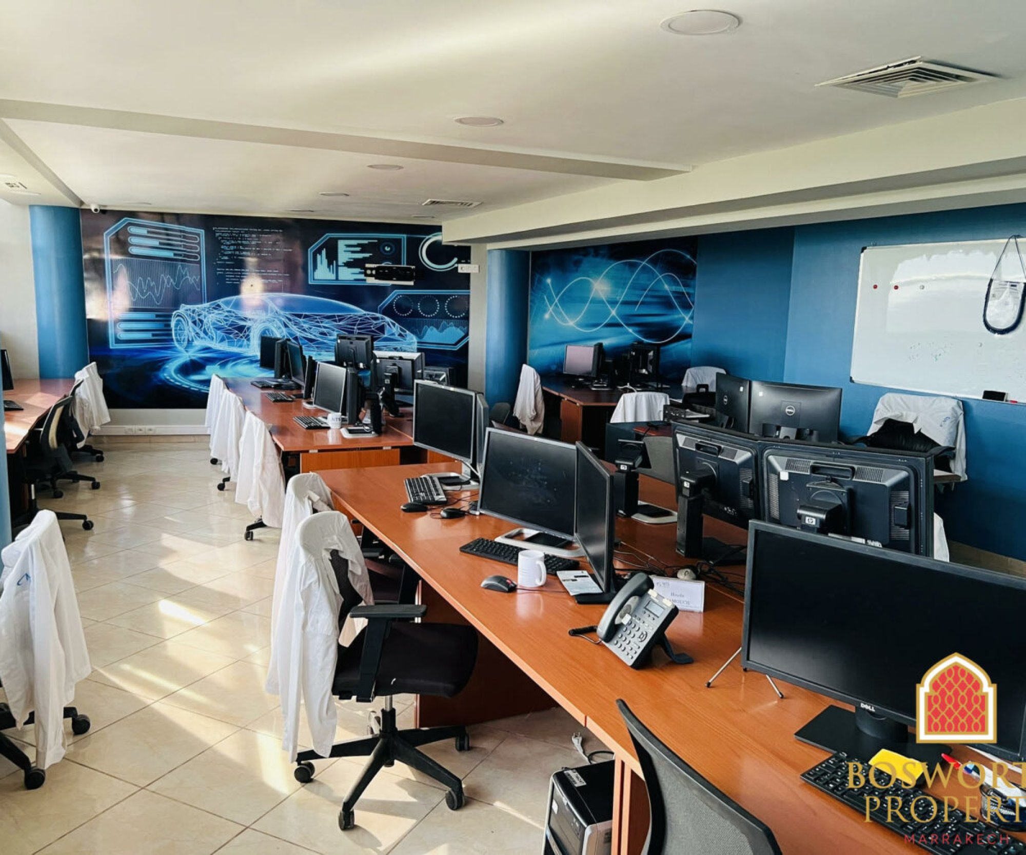 Modern Office Space For Sale Near Casablanca. An easy commute from both Casablanca and Rabat, this bright, spacious, 198m2 office space in beautiful beach-side Bouznika offers everything you need for a successful and comfortable working environment. Two floors of open-plan offices with lots of bright natural light, plus a welcoming reception area, 3 private offices, bathroom and kitchen facilities, and a large server room. All furniture and brand new IT equipment is available for sale separately. With cafes, shops, and pharmacies nearby, as well as the beach, it’s a convenient and attractive base for your team. Available now for 225,000 Euros! Call Colin now on or write to +212658025028 [email protected] for more information.