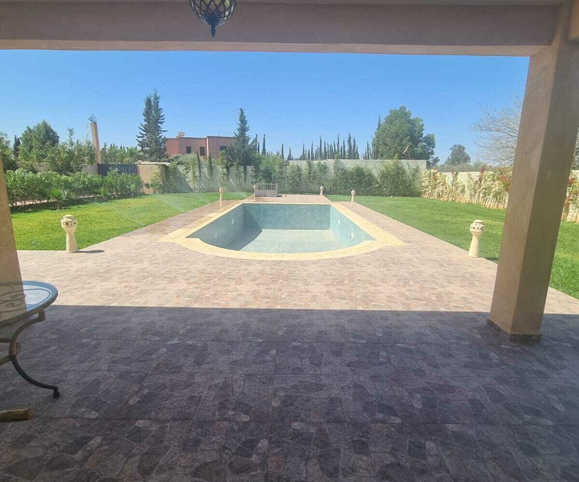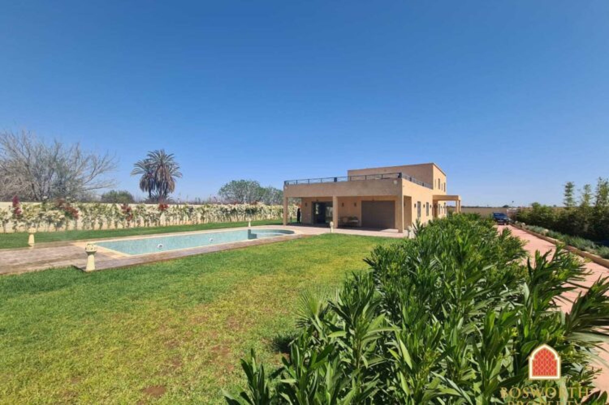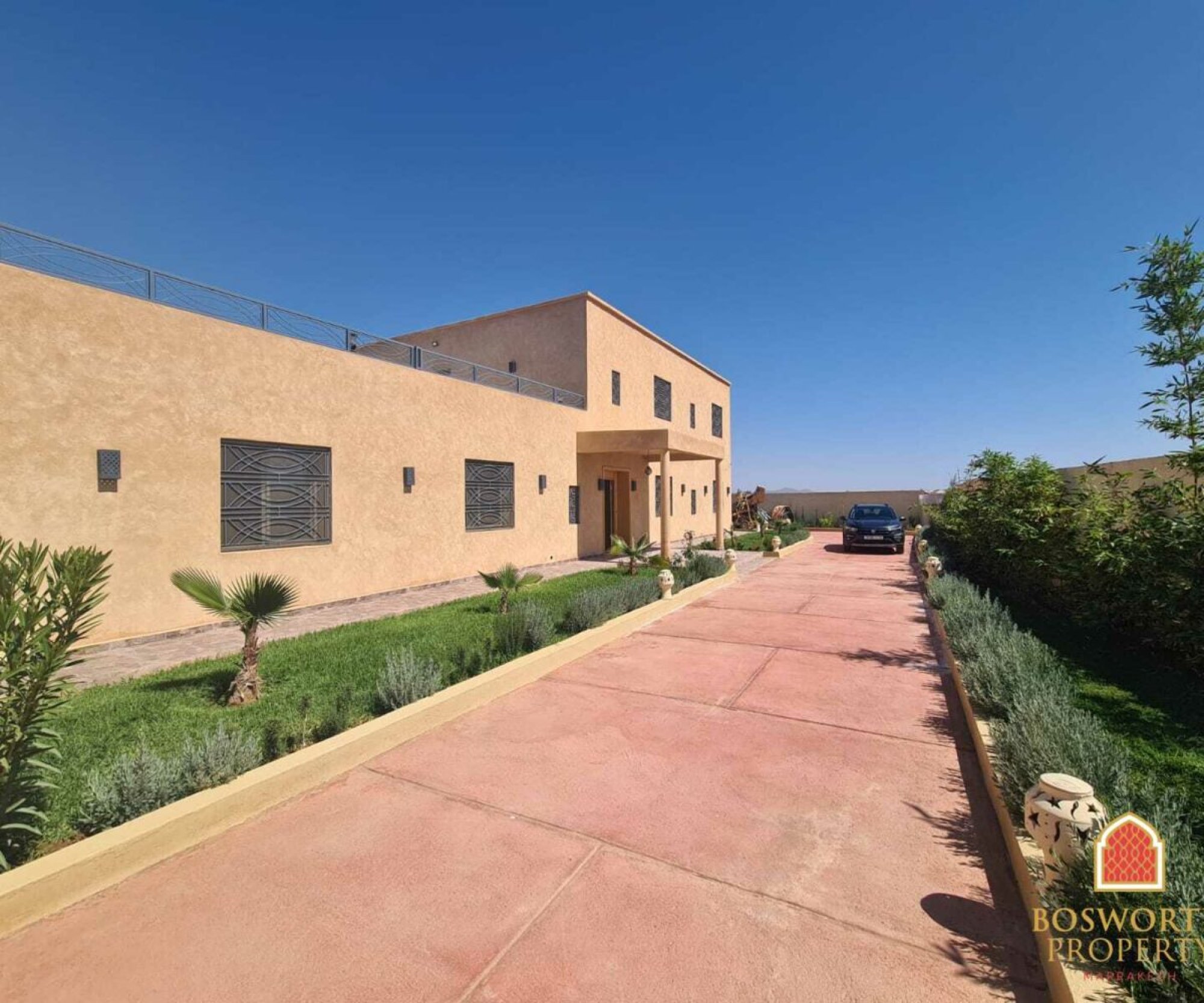 New 8 Bedroom 8 Bathroom Villa with Pool For Sale Marrakech. This is a huge, just finished new build villa off the Route de Fes 15km from the centre of Marrakech. The house is quietly situated on a minor road and off a short gravel track. The property would be ideal for rental use, either as an auberge or as a whole house let. Please note that due although the house is held on a freehold title, it is in an agricultural zone which restricts potential owners to those with Moroccan, Tunisian or Senegalese nationality. Please call us on 00212655446749 or email contact@bosworthpropertymarrakech for more details