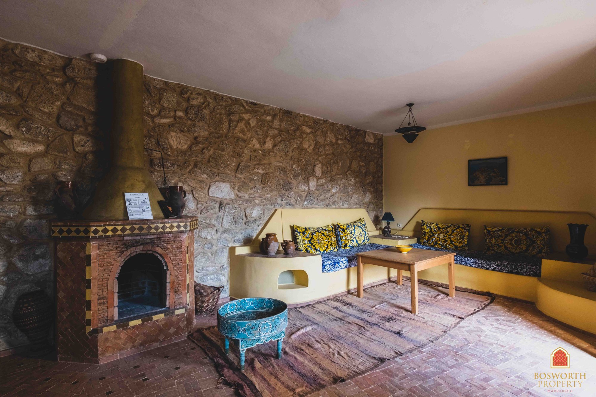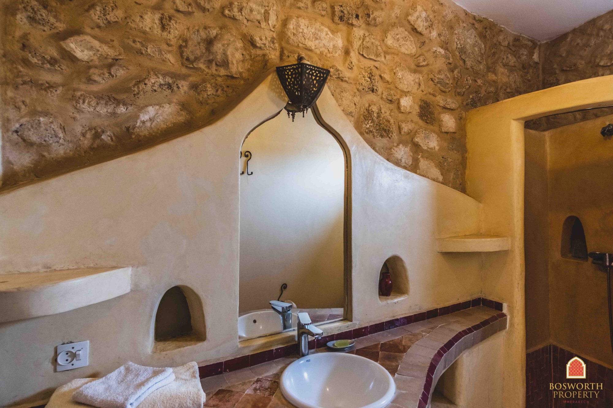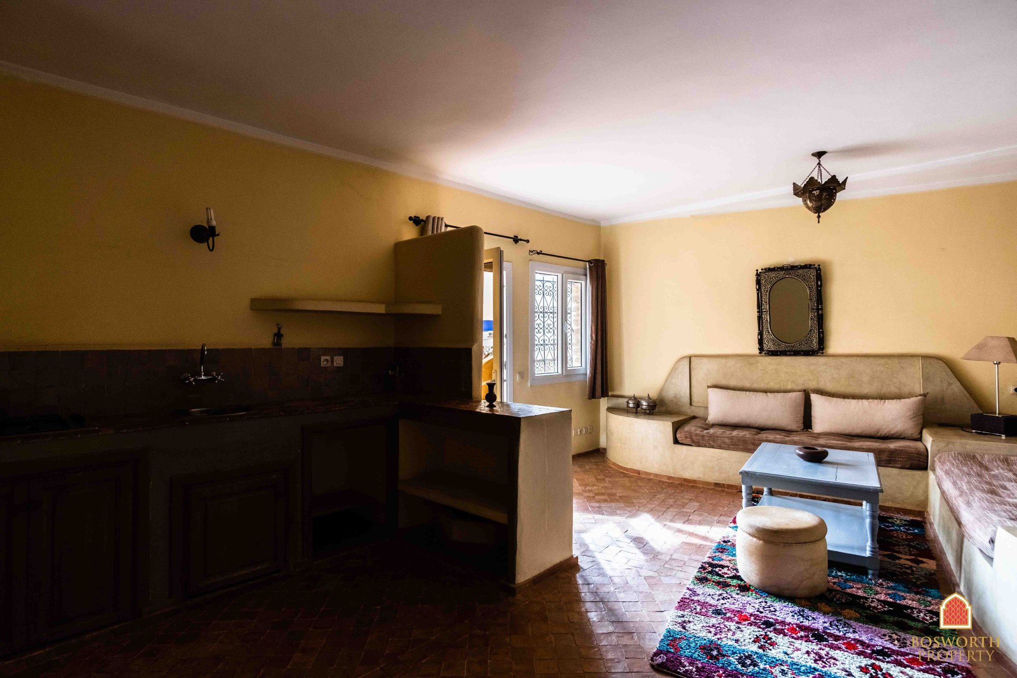 There are three apartments on the ground floor and four apartments on the first floor. Each apartment has a large living room, kitchen and a comfortable bedroom and bathroom. We find lovely local materials throughout the property: tadelakt on the walls, bejmat floors and stone walls.