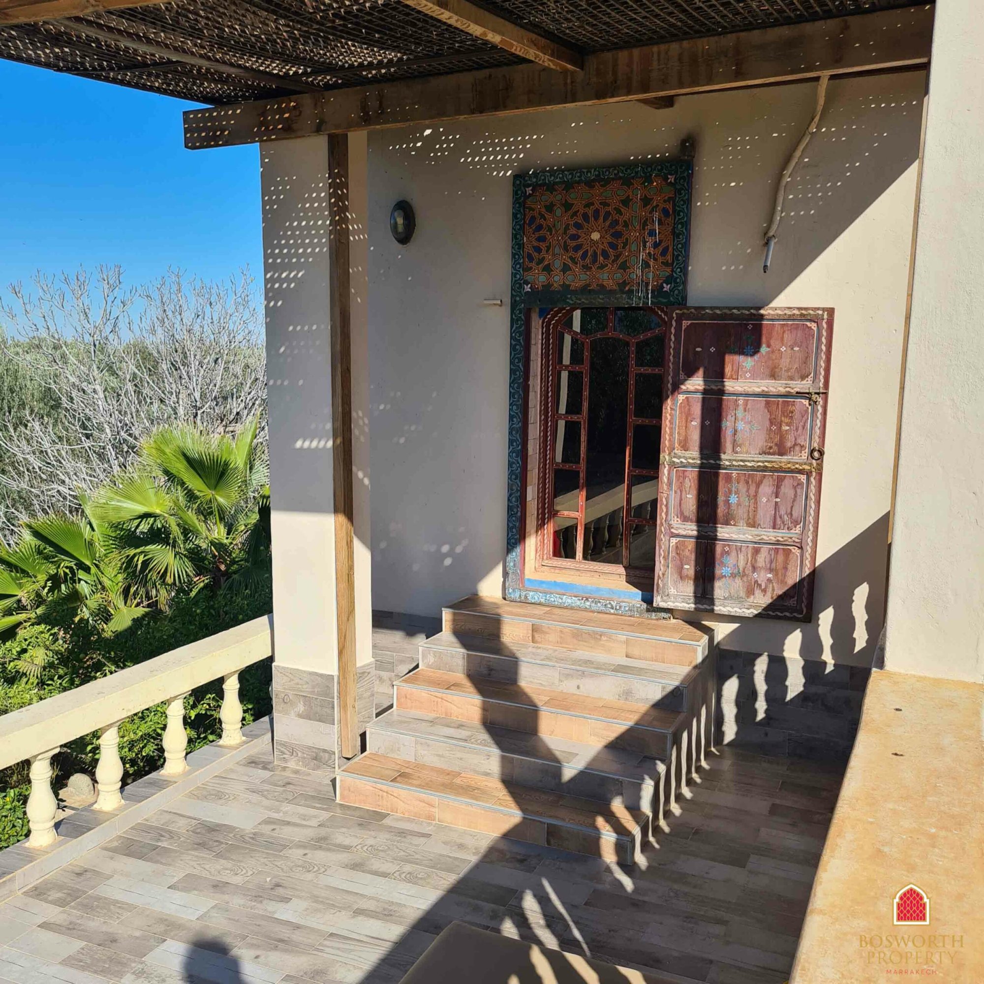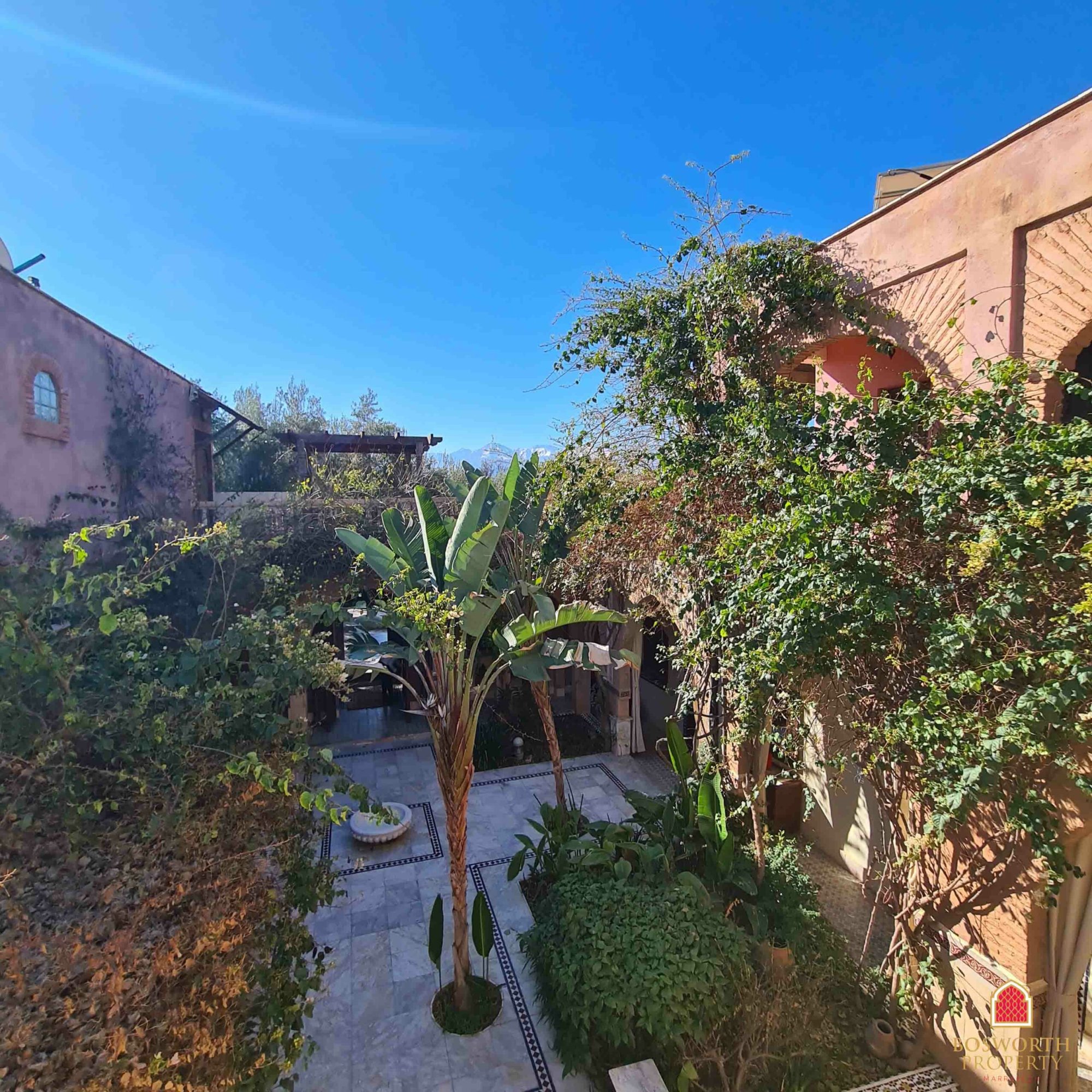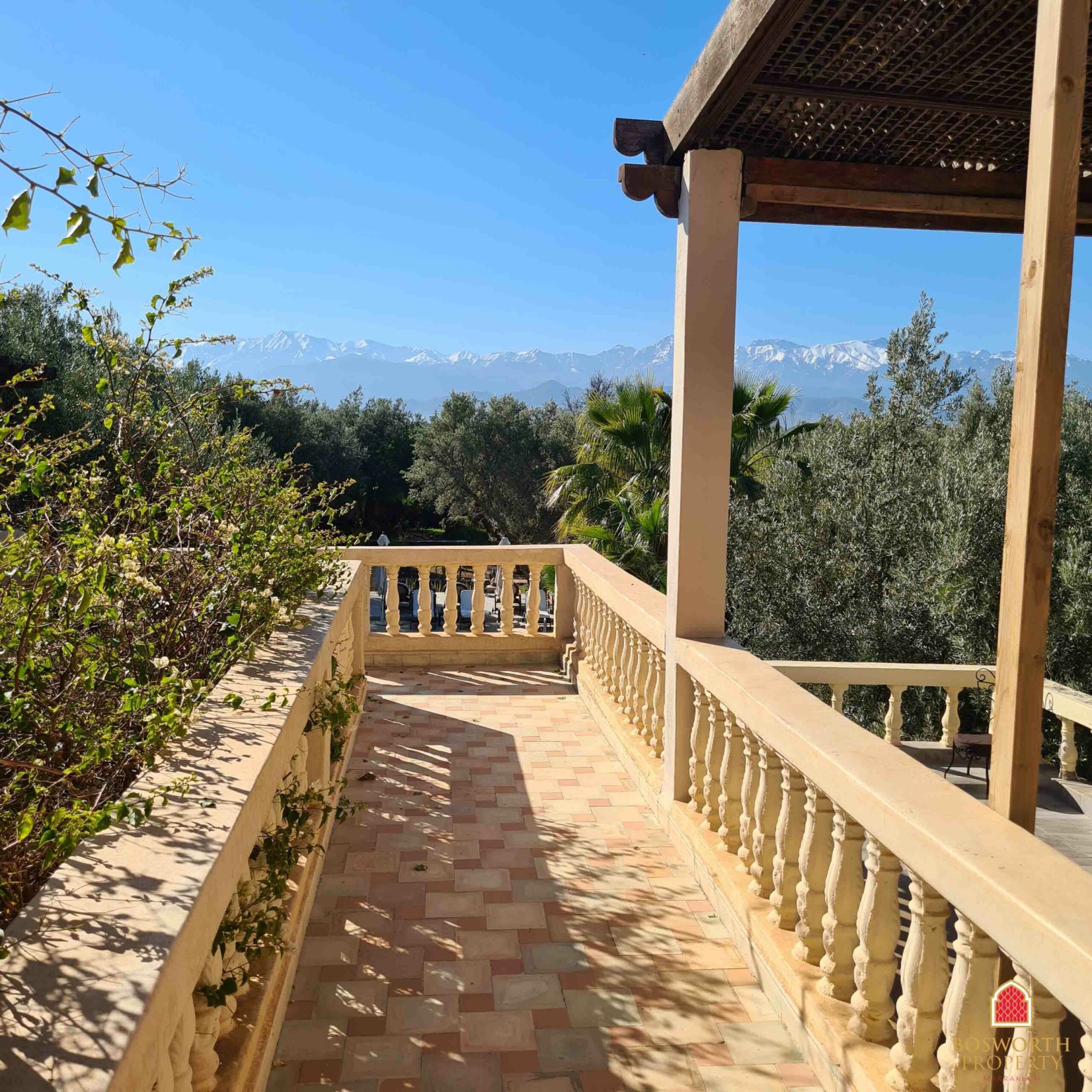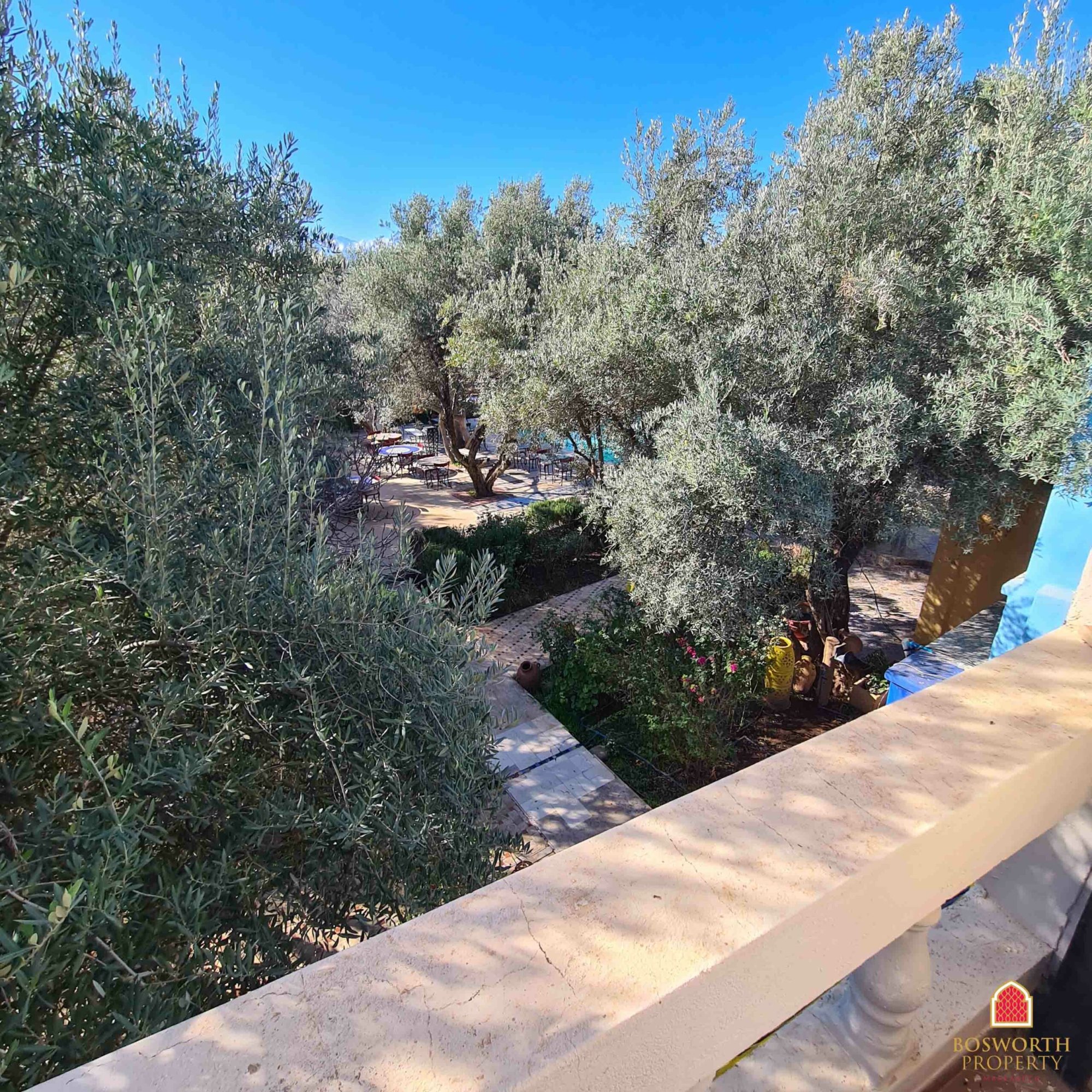 At present the property comprises a walled olive grove, with impressive entrance gates. The old Riad has been substantially renovated and extended to provide luxurious guest accommodation on the ground and first floors. There is a beautiful swimming pool overlooked by extensive terraces. A separate building houses the reception area and office. Behind the pool is a large restaurant building, with a commercial kitchen behind and a first floor elevated terrace giving stunning views of the Atlas snow caps on a clear day.