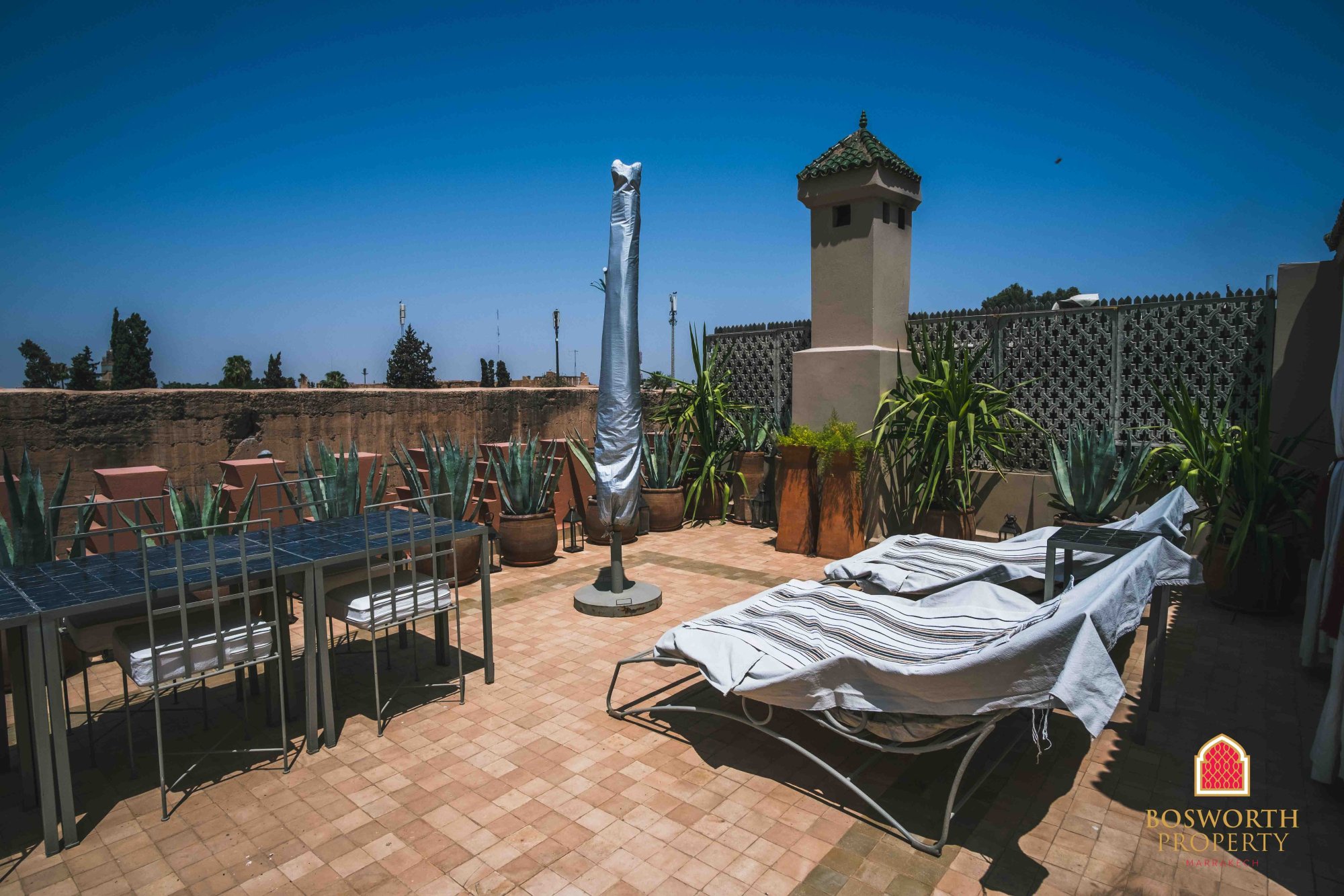 With just three beautiful en suite bedrooms and a genrous footprint of 127m2, this luxury Riad boasts elegance, superb interior design and a top location. In top condition throughout and fully titled. There are magnificent views from the terraces, taking in the Royal Palace, the High Atlas Mountains, Koutoubia Mosque and all the Medina. Stand out value at just 700'000 euros! WhatsApp me now on +212 6 5802 5028 or fill in the contact form on this page to arrange your private showing.