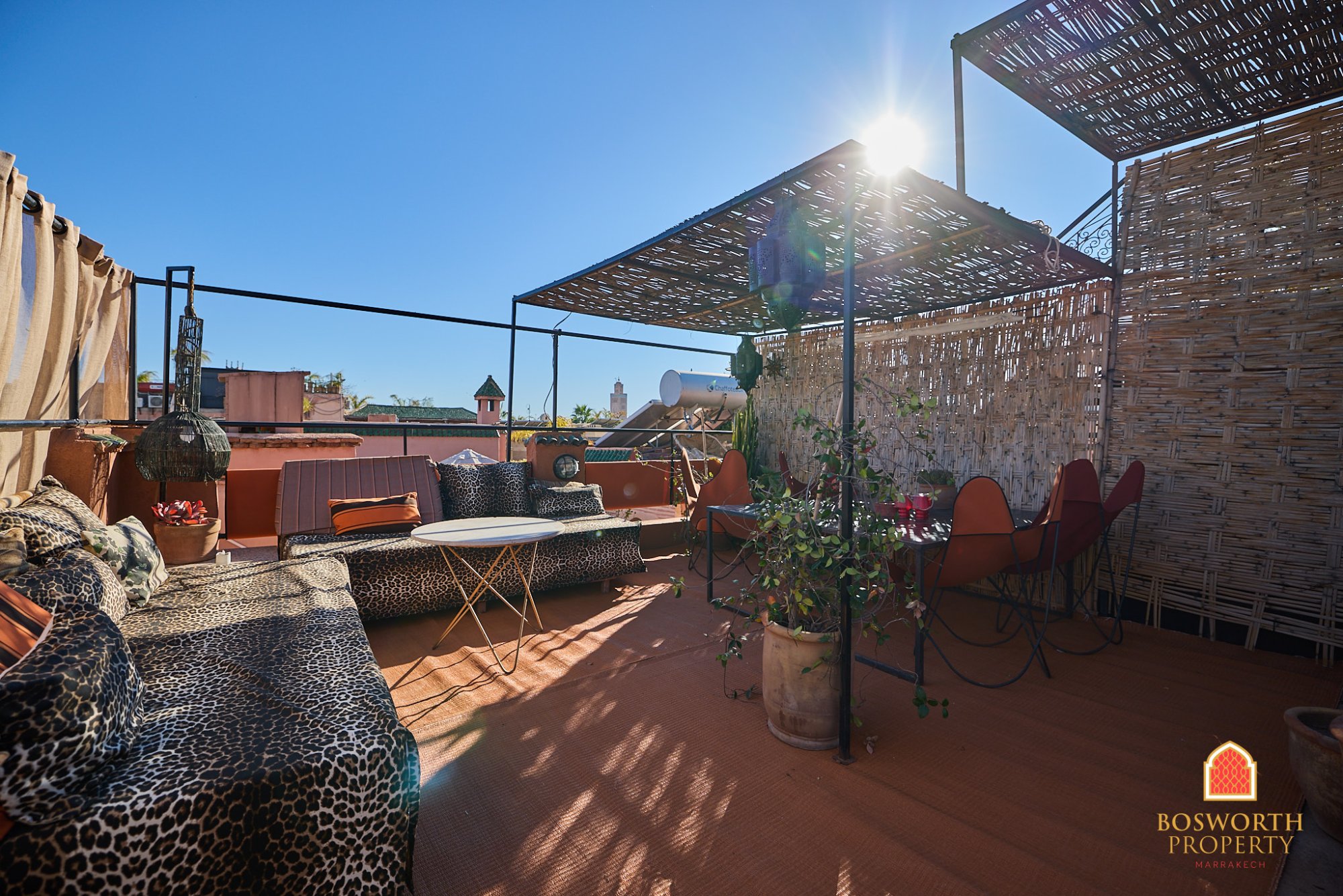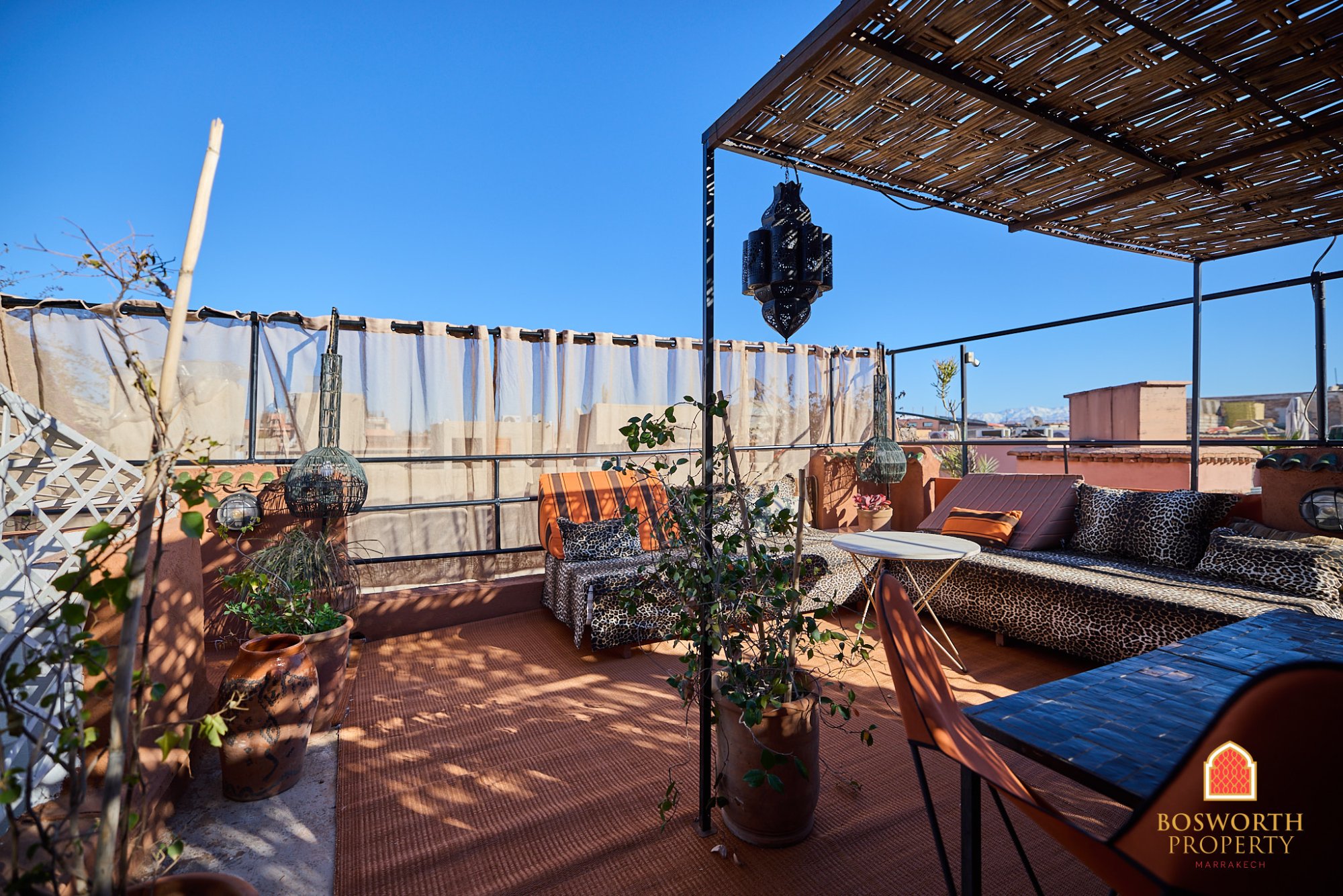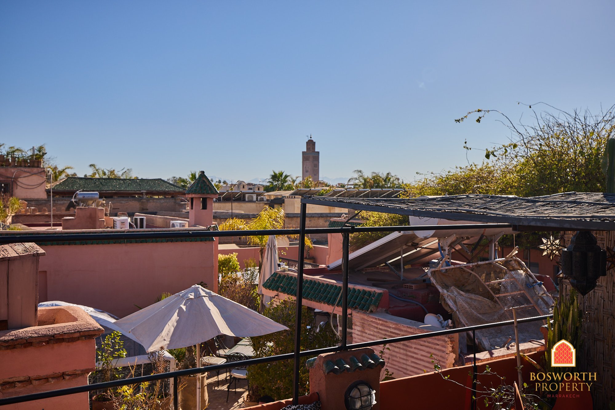 On the terrace, we have some amazing views looking over the iconic Koutoubity mosque and High Atlas mountains. The location is incredible, quiet yet a few steps away from the Jema el Fna square, Jardin Secret. rooftop bars and restaurants... It is currently being rented on AirBnB and ideal for someone looking for a short term rental or Pied a Terre in the heart of the medina.